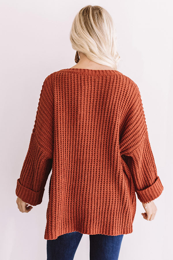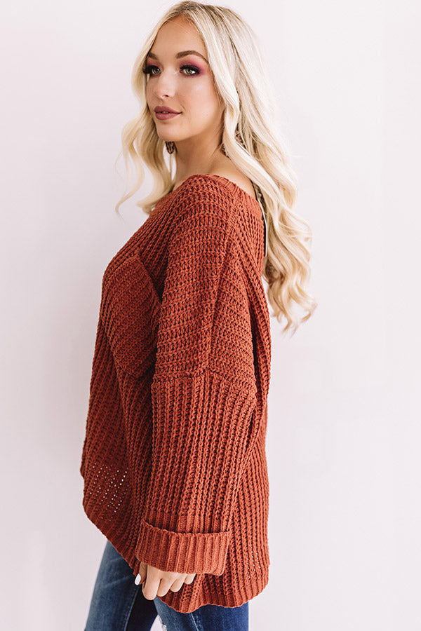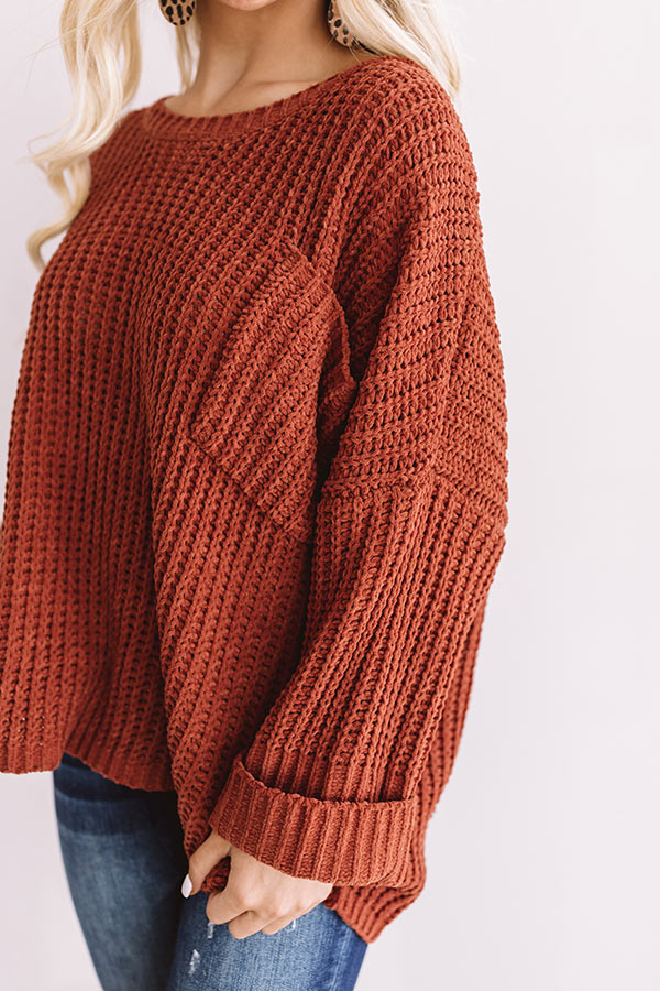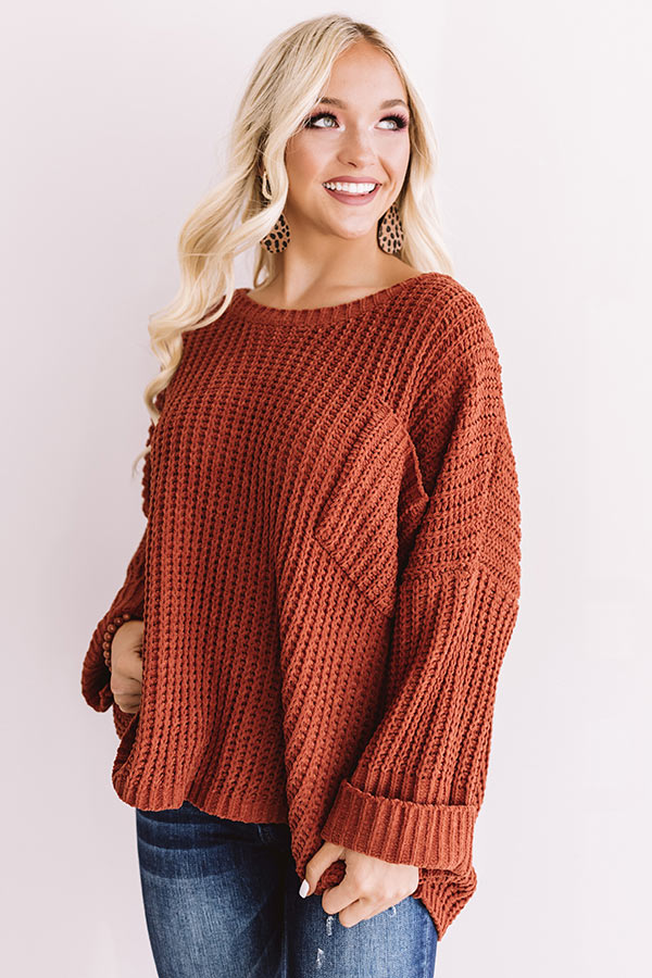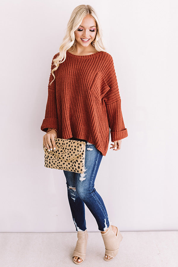 Get ready to feel the "autumn bliss" with this rust colored sweater featuring lightweight loose knit material, ribbed texturing, a rounded neckline that can be worn off ones shoulder, long quarter length sleeves with rolled cuffs, a chest accent pocket, and an ultra relaxed bodice that falls into a straight hemline! We have styled this warm and cozy piece with some distressed ankle skinnies, neutral peep toe wedges, and a cheetah print clutch, but you can also wear it with some black flares, "The Macon Faux Suede Bootie in Leopard," and our "Own The Spotlight Leopard Hat!" Measurements