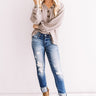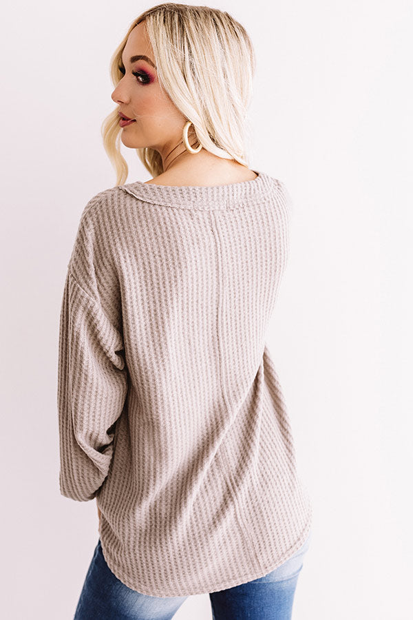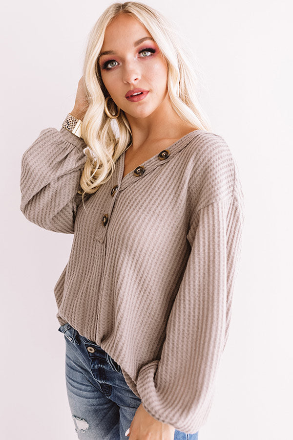 There is no better piece to enjoy the "autumn breeze" in than this taupe top featuring a lightweight waffle knit material, long bishop sleeves with elastic banded cuffs, a tortoiseshell button up bodice with a v-cut neckline, a center back accent seam, and a relaxed silhouette that falls into a straight hemline! This casual transitional piece can be styled with some distressed ankle skinnies and neutral booties, or you can wear it under our "Everything Pumpkin Spice Sherpa Vest" with black flares, "The Jess Faux Suede Heel in Natural," and our "Tribeca Travels Faux Leather Tote in Warm Taupe!" Measurements