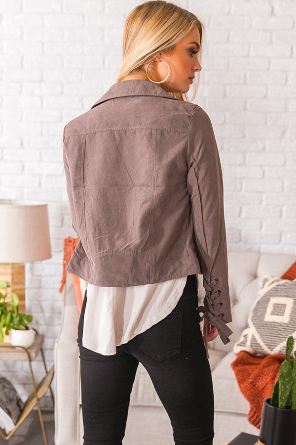 When the leaves start to change, step out in style, in a jacket that offers the perfect warmth & coverage for the crisp Fall days ahead. This lightweight moto style jacket features a collared neckline, asymmetrical zip closure & ultra sassy lace up sleeves. Layer this jacket over any of your favorite basics to add a femme & flirty touch to any look.