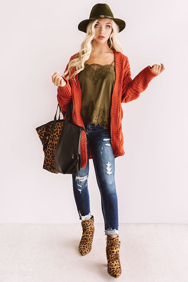When the chilly autumn weather makes its debut, stay warm with this vibrant rust colored cardigan featuring a loose cable knit material with braided and ribbed texturing, long oversized sleeves with thick forearm cuffs, and an ultra relaxed open front silhouette that falls into a rounded hemline! You can style this versatile piece with just about anything from a basic tank to a sweater, jeans to dresses, wedges to sandals, clutches to totes, and hats to earrings! Measurements
