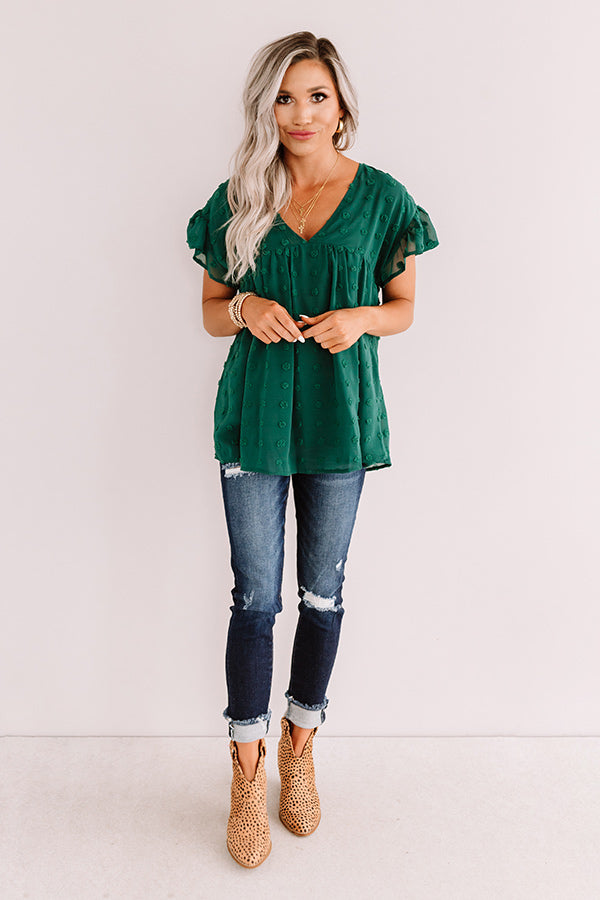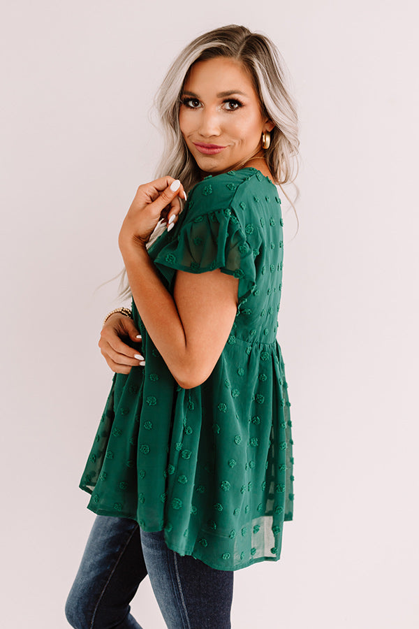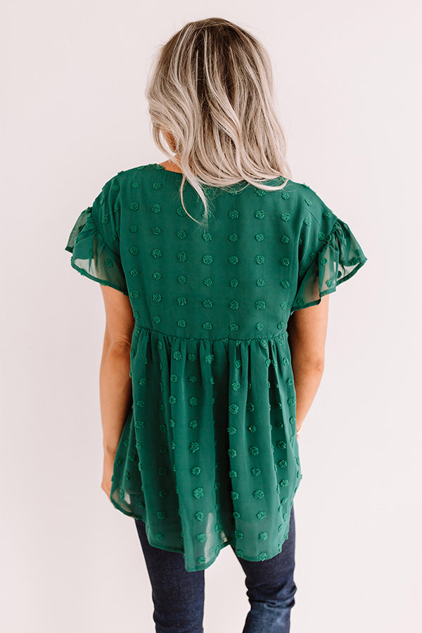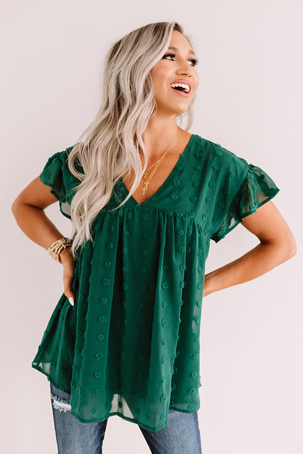 Get ready for autumn in this adorable hunter green colored top featuring lightweight breezy material patterned with large polka dot texturing, a v-cut neckline, short loose sleeves with ruffled trim detailing, and a relaxed babydoll silhouette that falls into an uneven hemline! Measurements