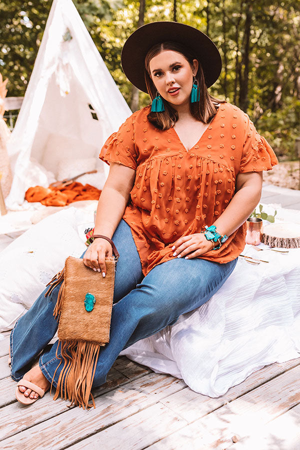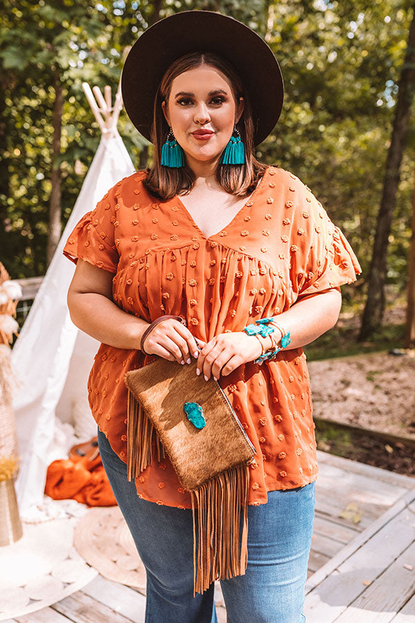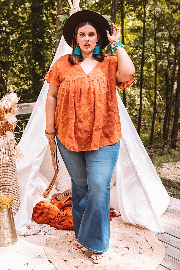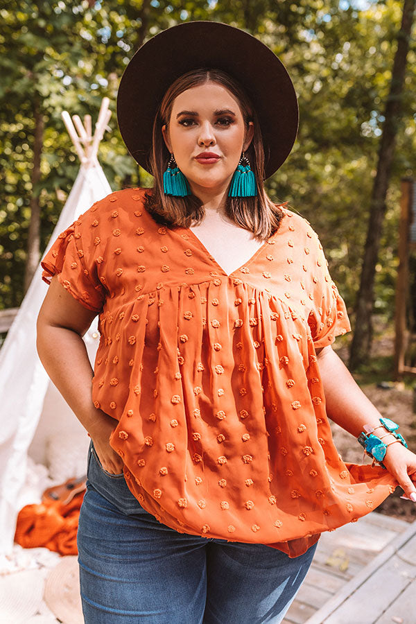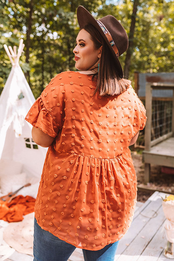 Plus Size - Get ready for autumn in this adorable rust colored top featuring lightweight breezy material patterned with large polka dot texturing, a v-cut neckline, short loose sleeves with ruffled trim detailing, and a relaxed babydoll silhouette that falls into an uneven hemline! This fall stunner styles perfectly with some medium wash flares, turquoise statement accessories, and a brown mule heel and wool hat, but you can also wear it with some black skinnies and "The Pryor Faux Leather Peep Toe Bootie in Maple!" Measurements