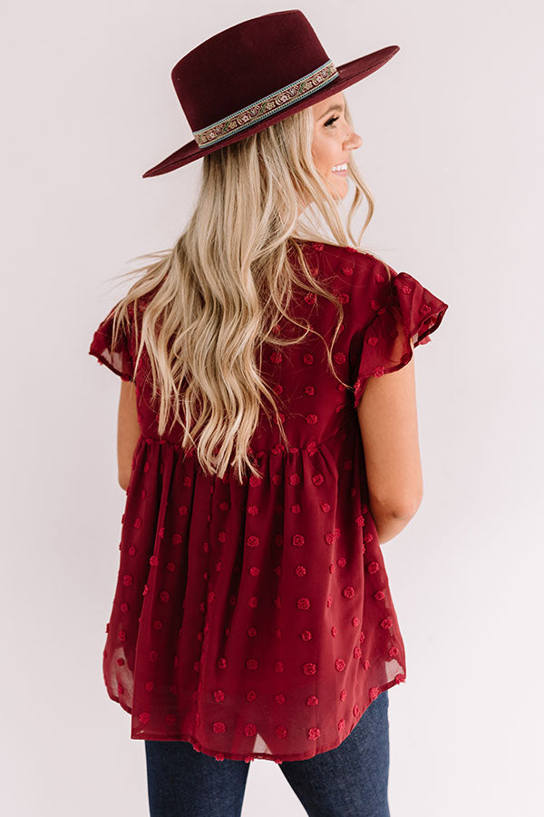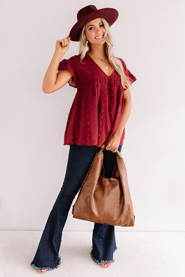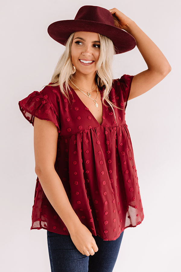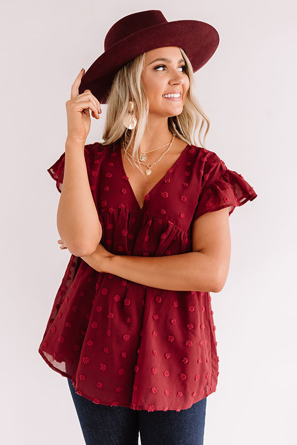 Get ready for autumn in this adorable wine colored top featuring lightweight breezy material patterned with large polka dot texturing, a v-cut neckline, short loose sleeves with ruffled trim detailing, and a relaxed babydoll silhouette that falls into an uneven hemline!