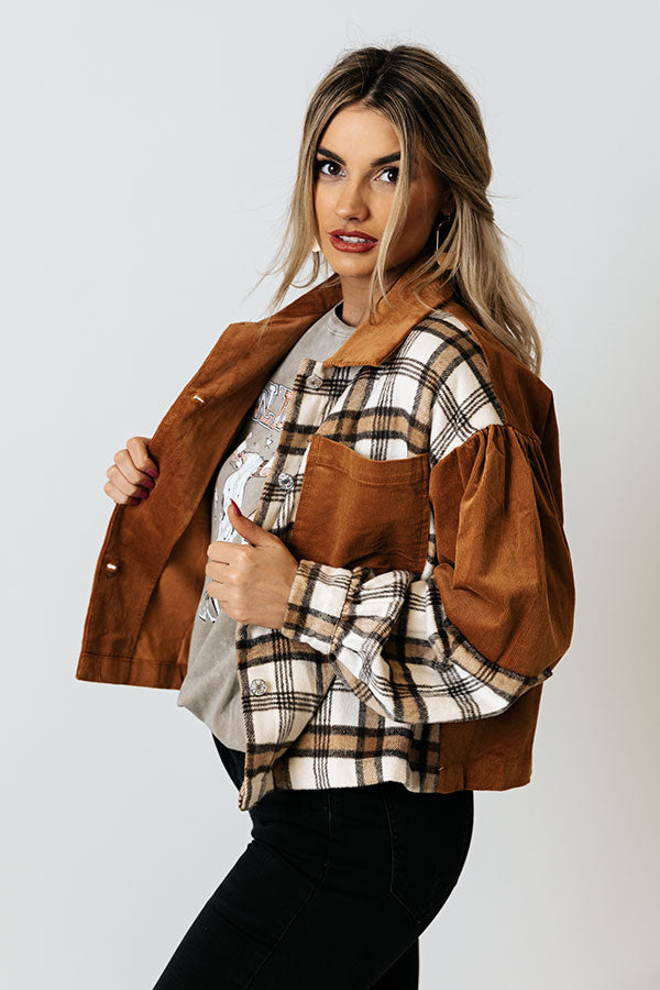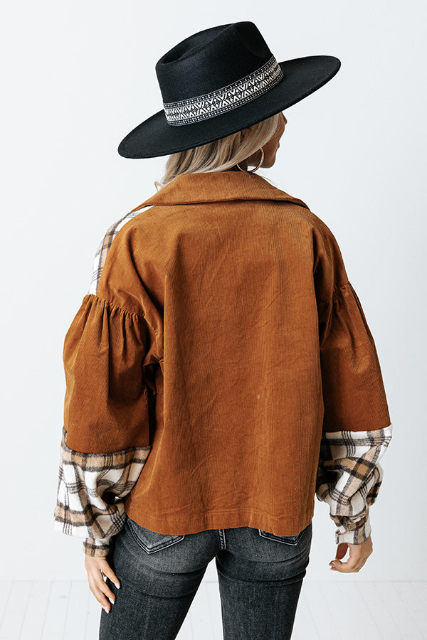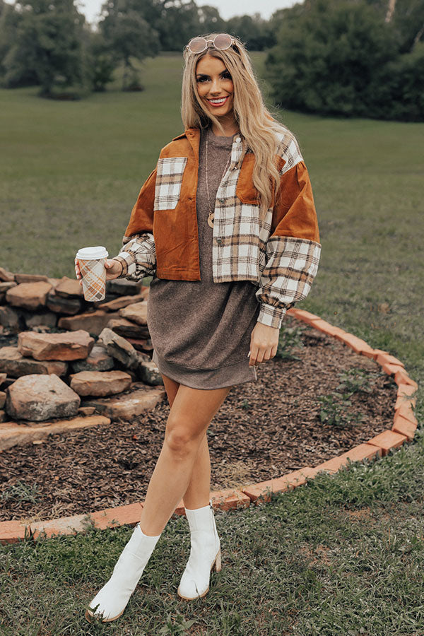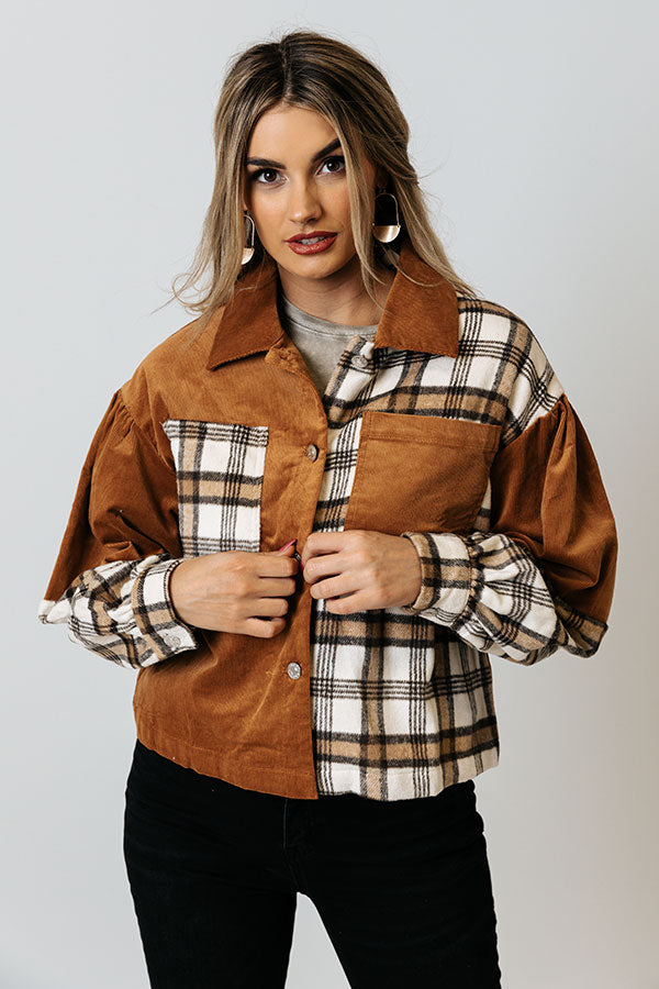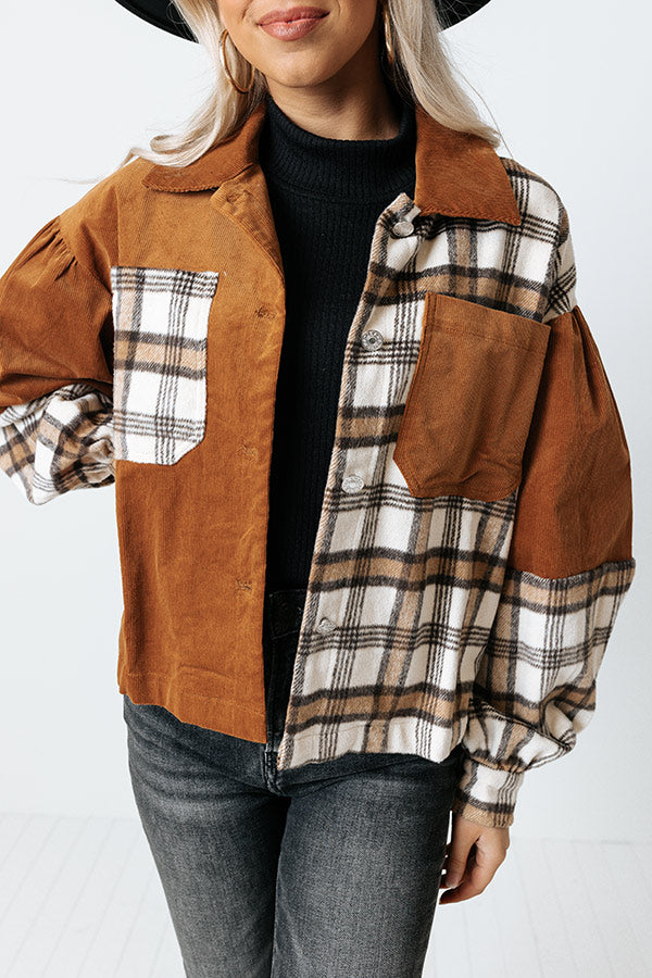 Welcome fall in the best of ways with our adorable 'Autumn Event' jacket featuring rust hued corduroy material with camel and black colored plaid print panels, a button down front with a collared neckline, two accent chest pockets, long loose sleeves with button closure cuffs, and a slouched silhouette that ends in a straight hemline!