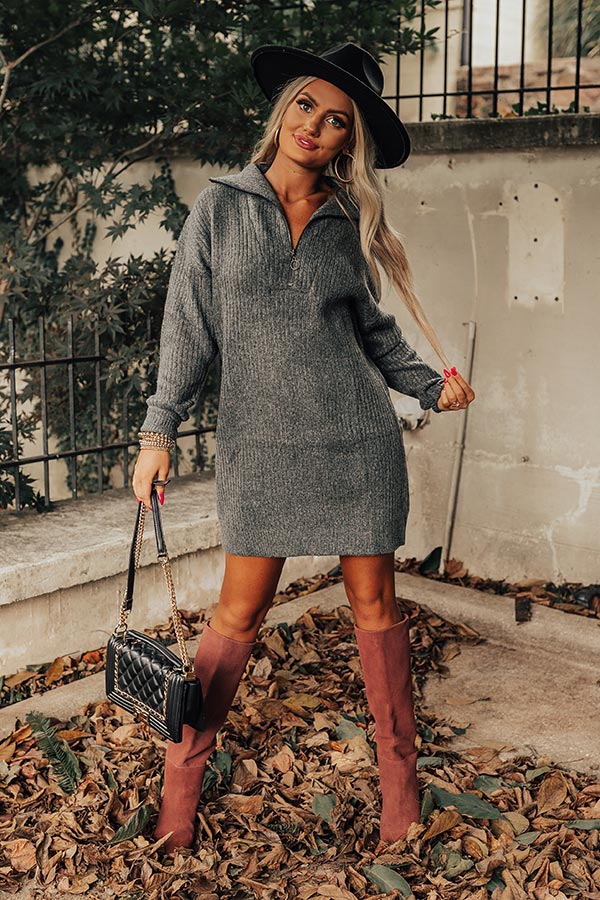 Perfect for every autumn event, this cute charcoal colored sweater dress features soft knit material with vertical ribbed texturing, a zip closure bodice with a collared neckline, long loose sleeves, and a relaxed but flattering silhouette that falls into a straight mid-thigh length hemline!