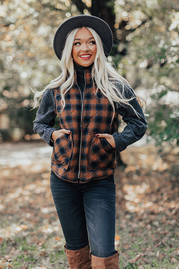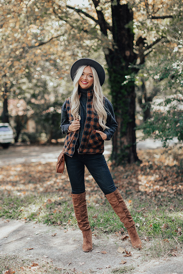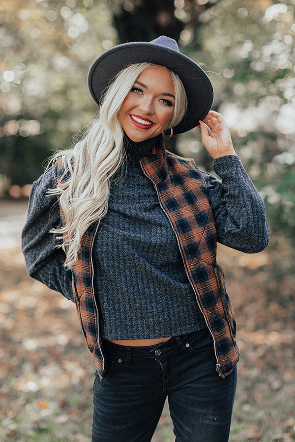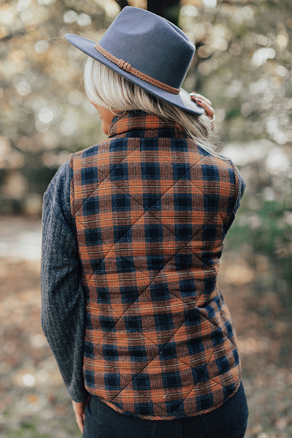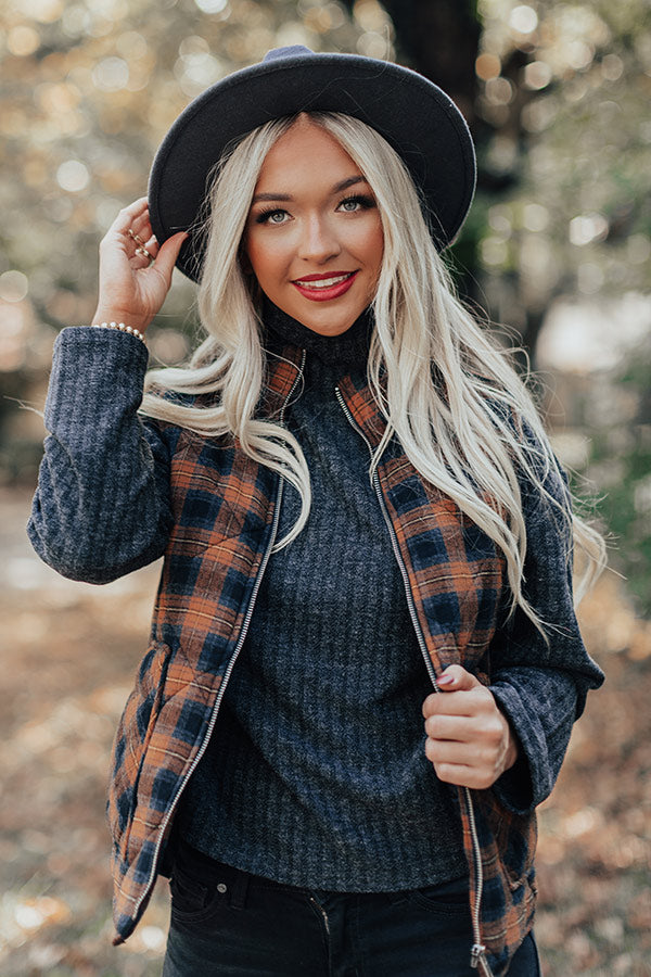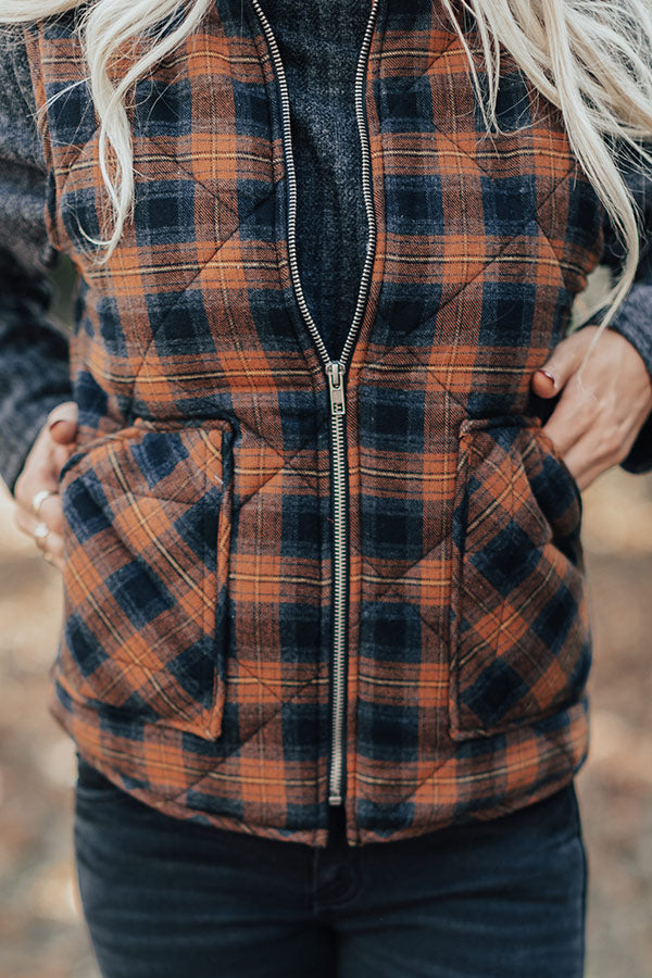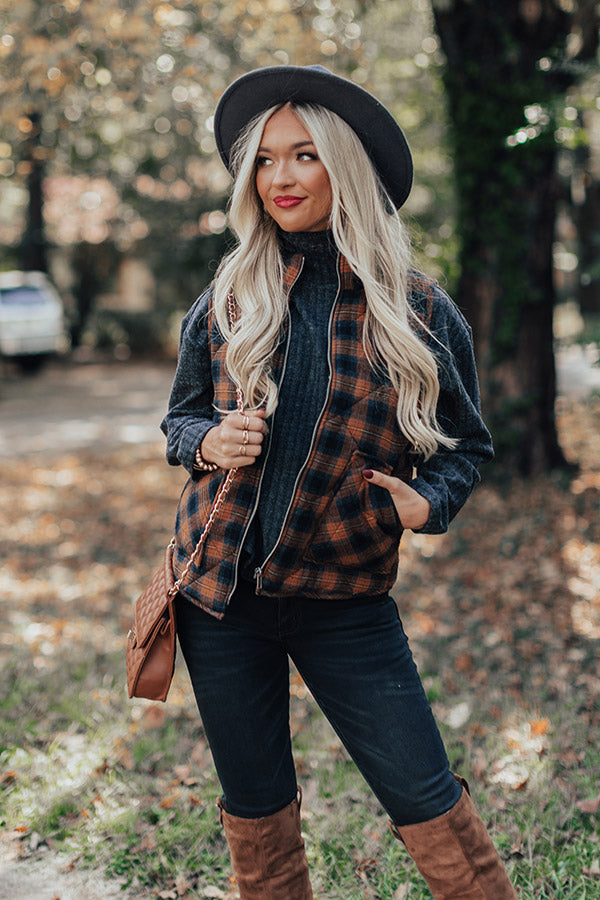 You are sure to be wrapped in warmth when you layer up with our festive "Autumn Hugs" vest featuring sleek lightweight material patterned with a navy and cinnamon colored plaid print, a zip closure front with a collared neckline, accent side pockets, wide sleeveless shoulders, and a flattering silhouette that falls into a straight hemline! Measurements