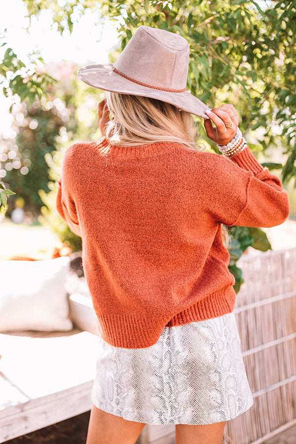 Nothing will put you in an "autumn mood" like a new festive sweater! This rust colored cutie features soft lightweight tight knit material, a high rounded neckline, long loose sleeves with flared cuffs, wide trim with ribbed texturing, and a relaxed silhouette that falls into a straight hemline! We have styled this fall essential with a snake print skirt and boot and a grey fringe faux leather tote and wool hat, but you can also wear it with some distressed ankle skinnies and "The Pryor Faux Leather Peep Toe Bootie in Maple!" Measurements