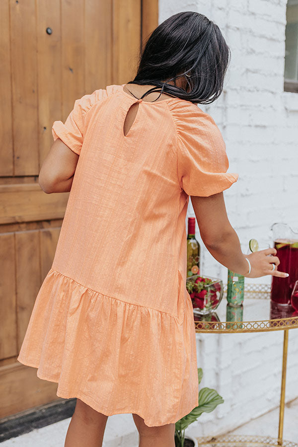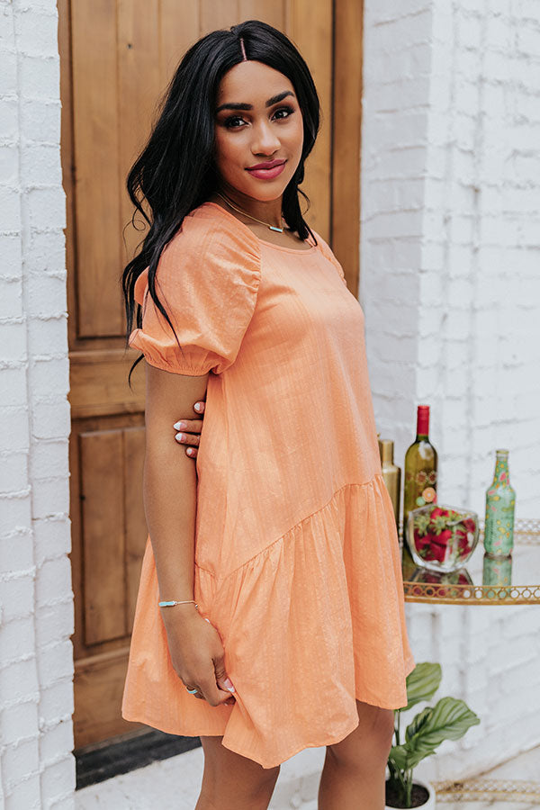 Eyes are sure to be on you when you arrive in our charming peach hued 'Away On A Yacht Shift Dress' featuring lightweight breezy material, with subtle vertical accent stripes, a rounded neckline, short bubble sleeves, a keyhole accented upper back with a button closure, and a relaxed silhouette that falls into an oversized peplum bottom with a straight mid-thigh length hemline! Measurements