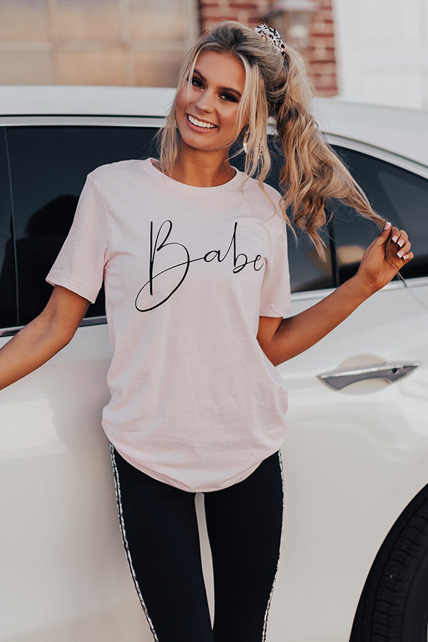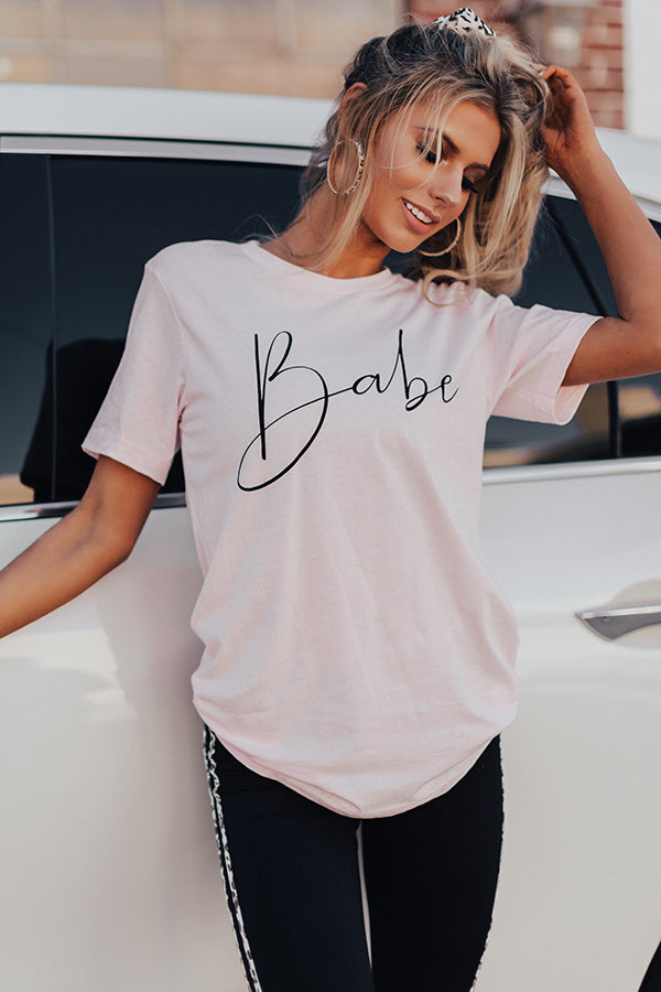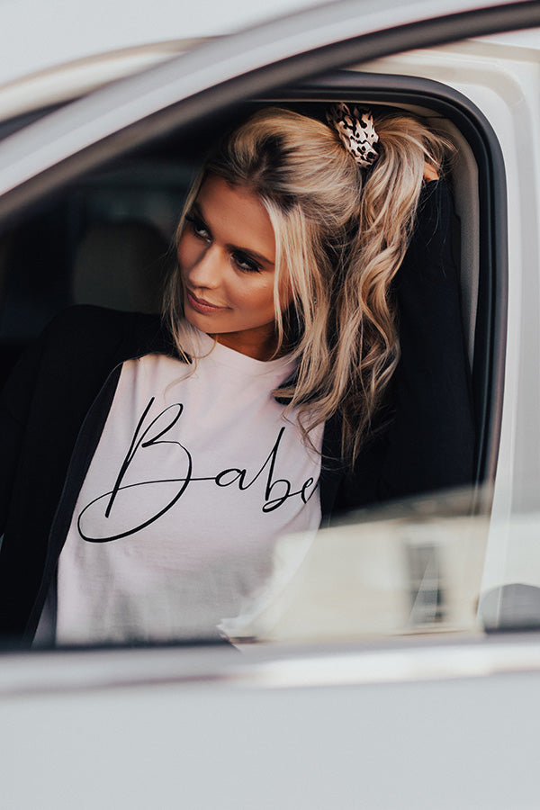 You are sure to look like a total "babe" when you wear this adorable light pink shift tee featuring soft lightweight material, a high rounded neckline, short loose sleeves, adorable black cursive writing on the front, and a relaxed silhouette that falls into a straight hemline! You can dress this cute athleisure piece down by layering it under a work out jacket with some legging and trendy sneakers, or you can style it up with some distressed light wash ankle skinnies, "The Emmaline Bootie in Black," a faux leather backpack, and our "All Caught Up Headband in Black!" Measurements