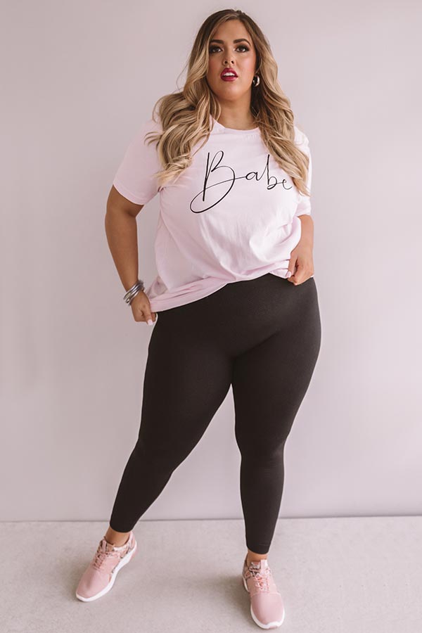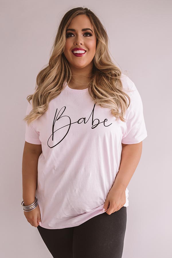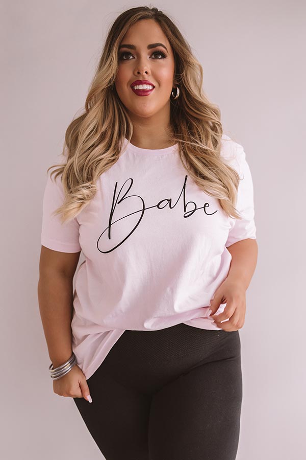 Plus Size - You are sure to look like a total "babe" when you wear this adorable light pink shift tee featuring soft lightweight material, a high rounded neckline, short loose sleeves, adorable black cursive writing on the front, and a relaxed silhouette that falls into a straight hemline! You can dress this cute athleisure piece down by wearing it with some legging and trendy sneakers, or you can style it up with some distressed light wash ankle skinnies, "The Emmaline Bootie in Black," a faux leather backpack, and our "All Caught Up Headband in Black!" Measurements