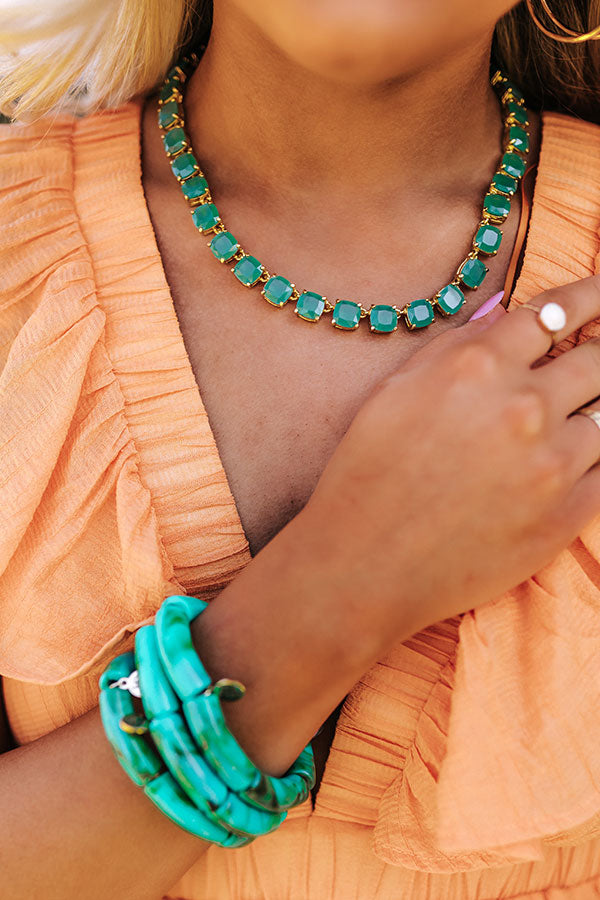 This gorgeous piece features gorgeous teal stones that are specially faceted for extra shine, ensuring the 'Baby Charlotte Necklace' will catch the light and eyes, alike! This necklace is 15" long with 3" extension and 3/8" wide with a lobster claw closure.