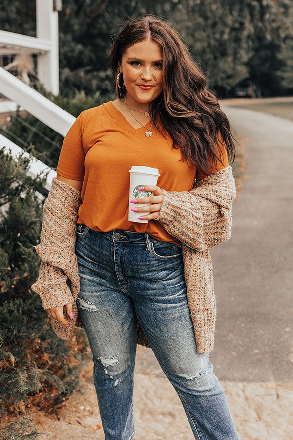 Plus Size - Get back to the basics with this casual but cute versatile rust colored tee featuring soft and lightweight shift material, a v-cut neckline, short sleeves, and a relaxed silhouette that ends in a rounded hemline! Measurements