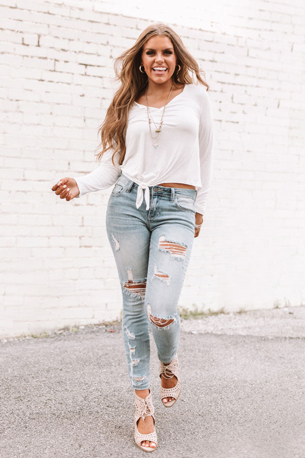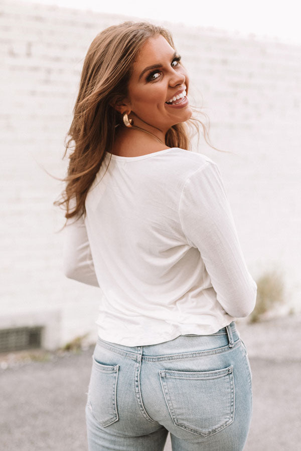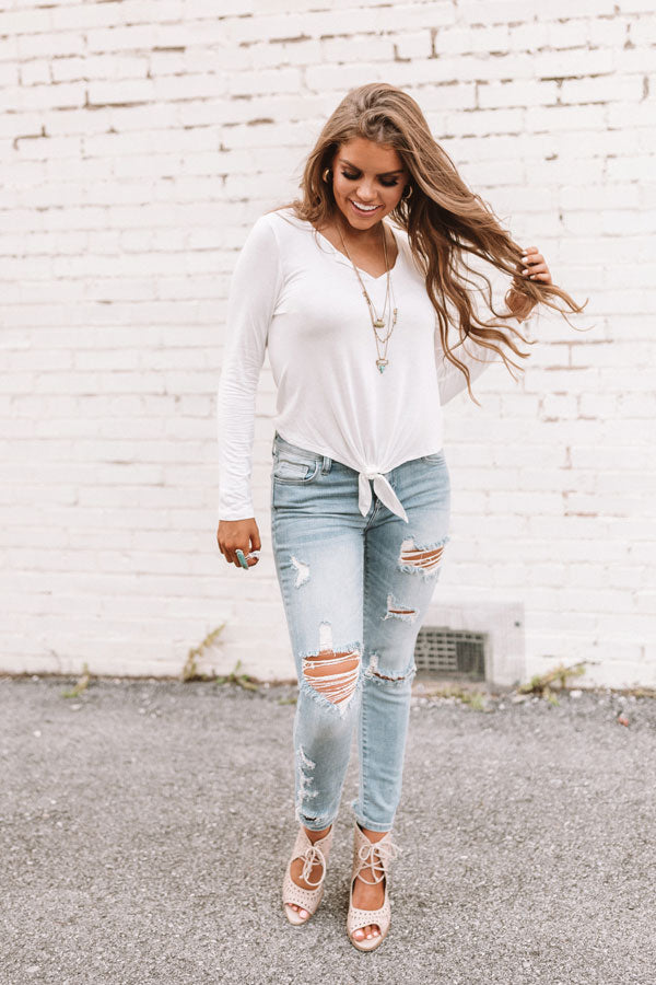You can never go wrong by going "back to the basics" and this white shift tee is a classic piece with its wide v-neckline, long fitted sleeves, lightweight material, and knotted front hem! This simple but versatile top can be dressed down with distressed skinnies, a long necklace, and a neutral cutout wedge, or you can style it up with our "Spotted In Milan Velvet Leopard Skirt in Grey," a black faux sued hat, and "The Clara Over The Knee Faux Suede Boot in Black!" Measurements