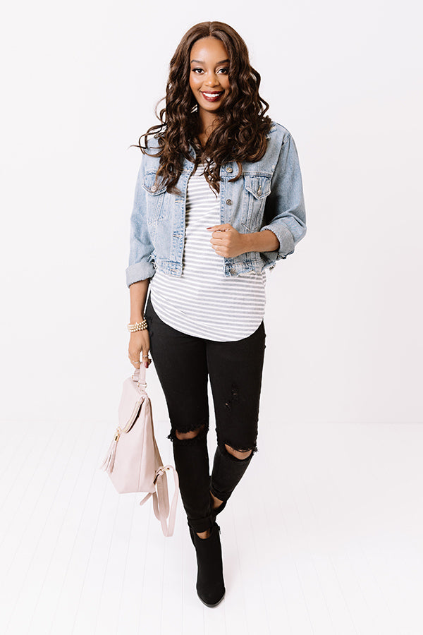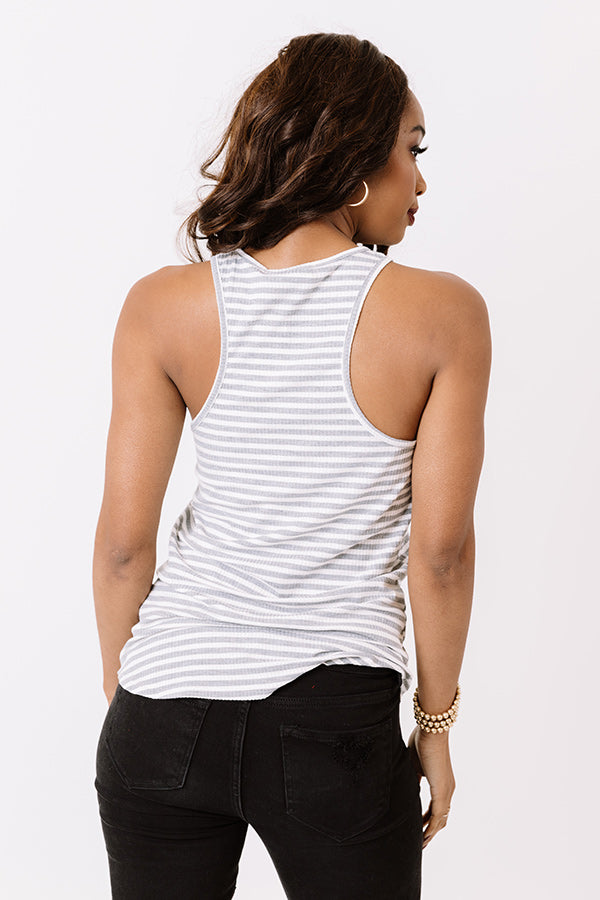 You are sure to receive endless compliments when you wear our casual cute "Back Together" tank featuring soft lightweight material with subtle vertical ribbed texturing, grey and white horizontal accent stripes, a scooped neckline, 2-inch sleeveless shoulder straps with a racerback fit, and a relaxed silhouette that falls into a rounded hemline!