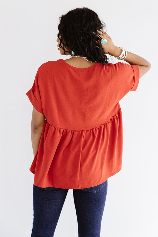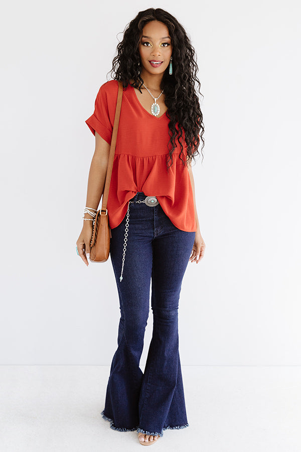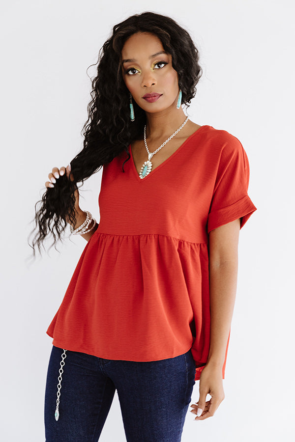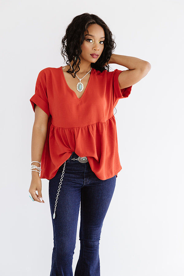 You're amazing style won't take a backseat when you wear this adorable rust colored top featuring lightweight material, a v-cut neckline, short loose sleeves with rolled cuffs, and a relaxed babydoll silhouette that falls into a straight hemline! You can style this casual cutie a variety of ways, like with some dark wash flares, turquoise statement accessories, and a brown mule heel and faux leather crossbody, but you can also wear it with some distressed white shorts, "The Alba Wedge in Rust," and our "Laying Out In Laguna Woven Hat!" Measurements