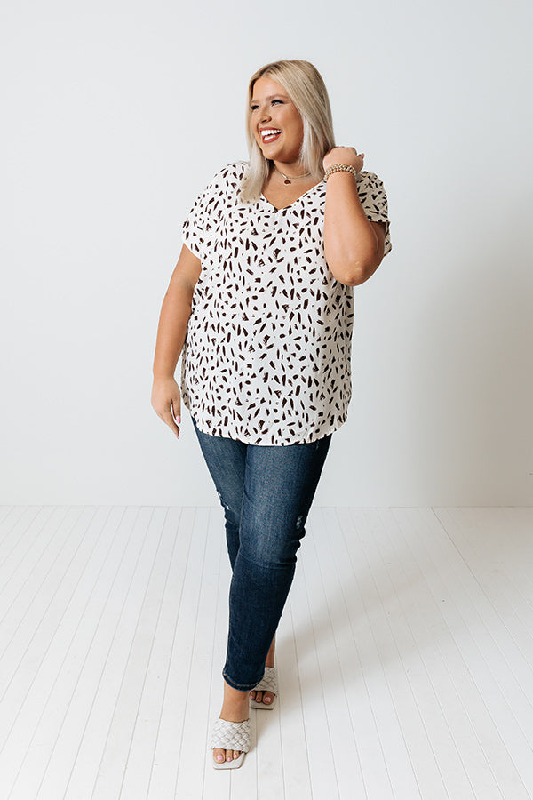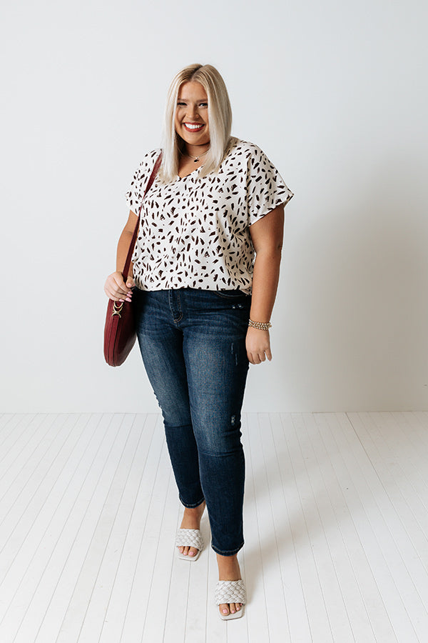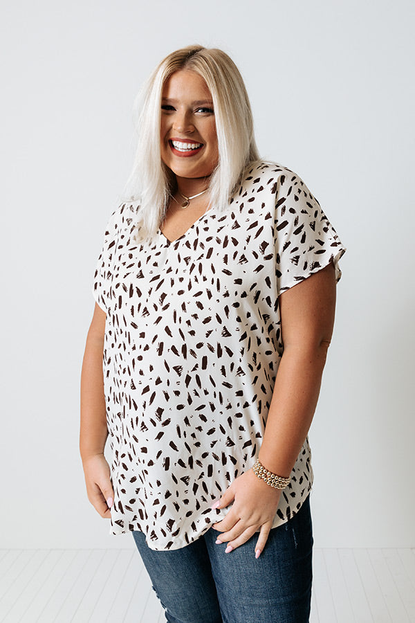 Add a chic piece to your transitional wardrobe with our elegant ivory 'Balancing Act Shift Top' featuring sleek lightweight material patterned with a black spotted print, a v-cut neckline, short sleeves, and a relaxed silhouette that falls into a rounded hemline!