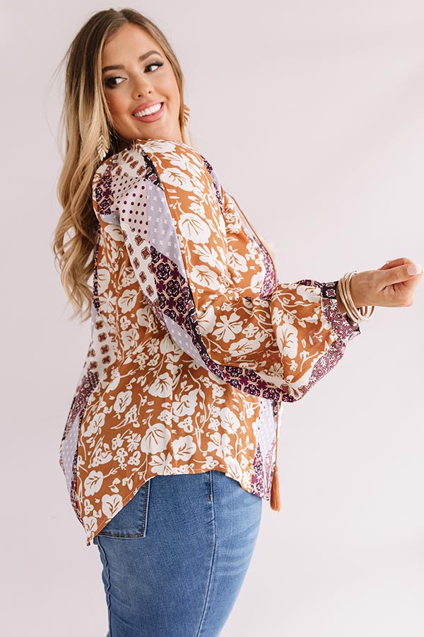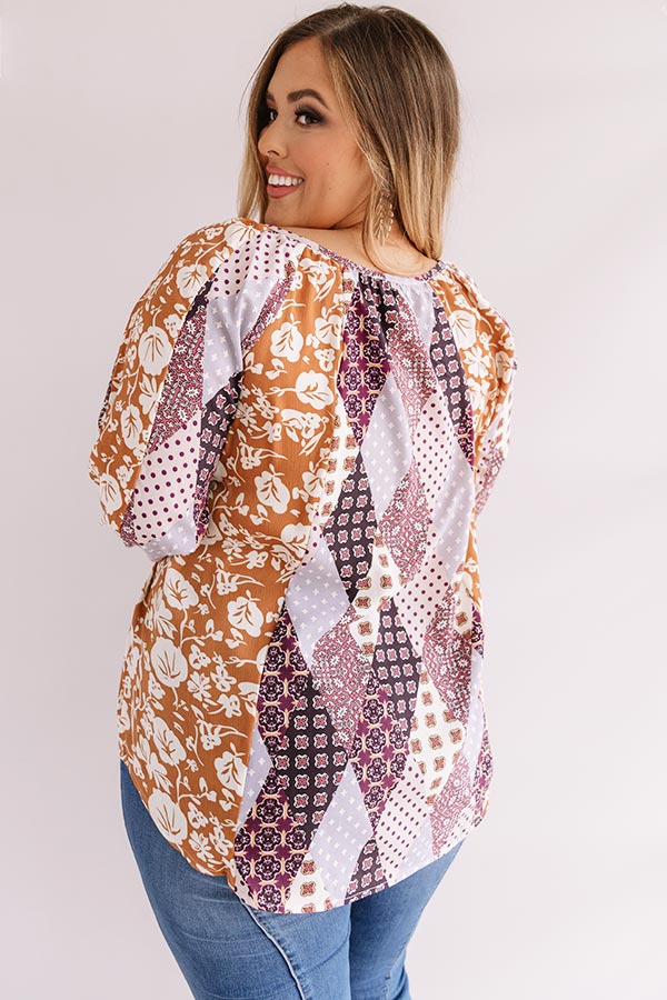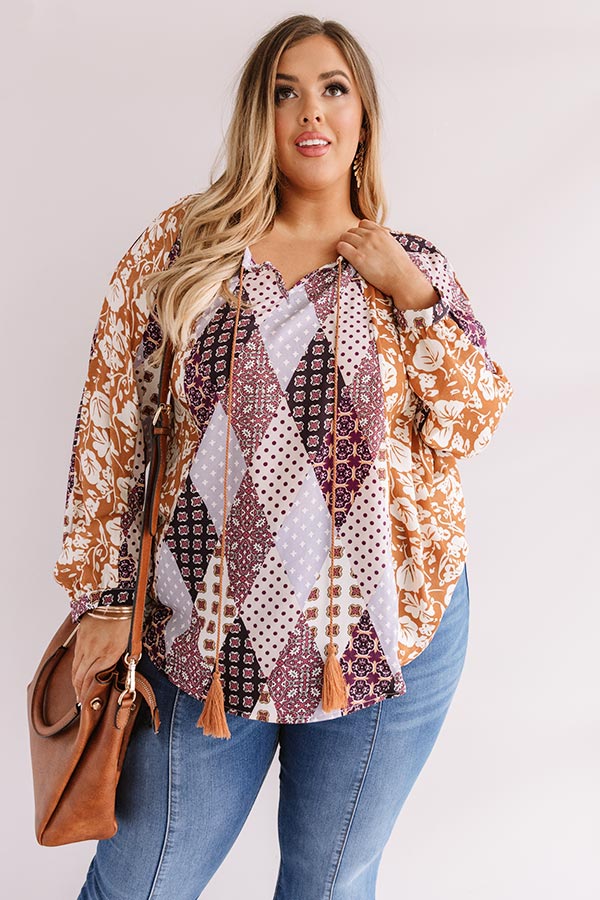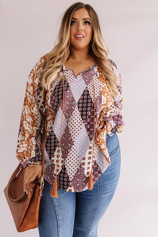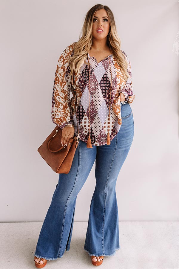 Plus Size - All eyes will be on you when you wear our adorable "Bali By Moonlight Shift Top" featuring lightweight material with an abstract purple hued diamond pattern and an intricate orange hued floral print, a v-cut neckline with a tassel string closure, long loose bishop sleeves with fitted elastic banded cuffs, and a relaxed silhouette that falls into a rounded hemline! We have styled this unique piece with some denim flares and a brown platform heel and crossbody, but you can also pair it with some distressed ankle skinnies and "The Underwood Faux Leather Wedge in Natural!" Measurements