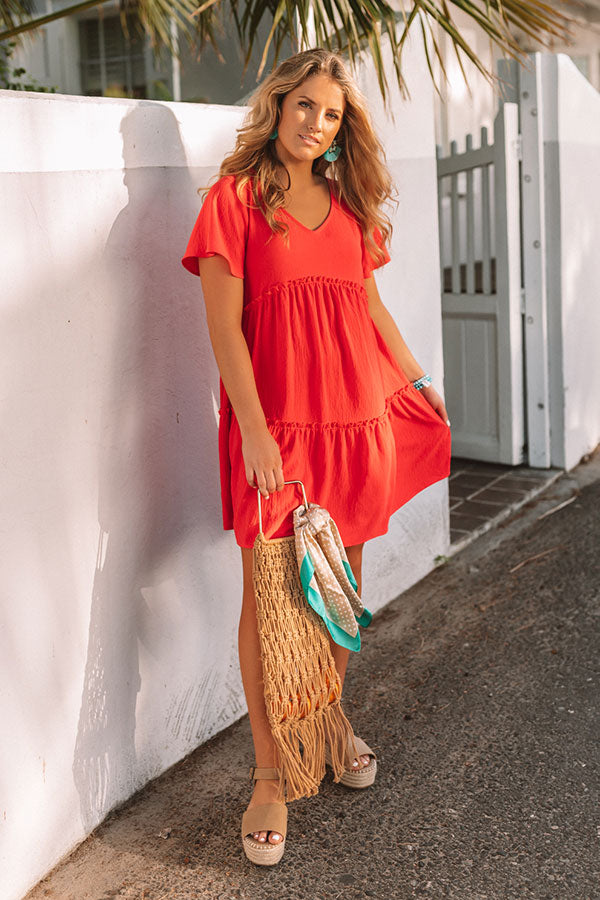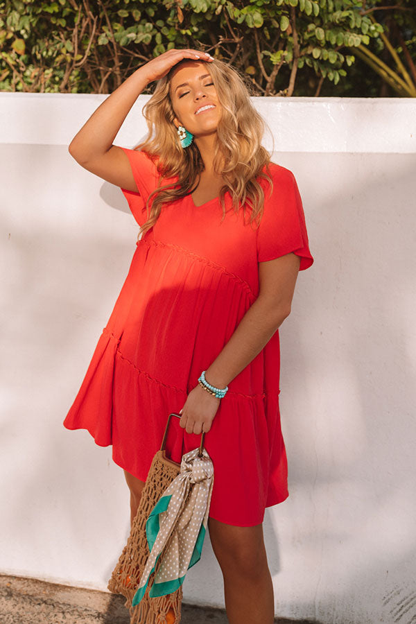 You will look like a total "Bali daydream" when you wear this adorable coral hued dress featuring lightweight breezy material, a v-cut neckline, short loose sleeves, ruffled exposed seam detailing, and an ultra relaxed silhouette that falls into an uneven mid-thigh length hemline! You can style this vibrant piece a variety of ways, like with neutral wedges and a net bag, but you can also wear it with "The Jess Faux Suede Heel in Grey" and our "All Caught Up Headband in Grey!" Measurements