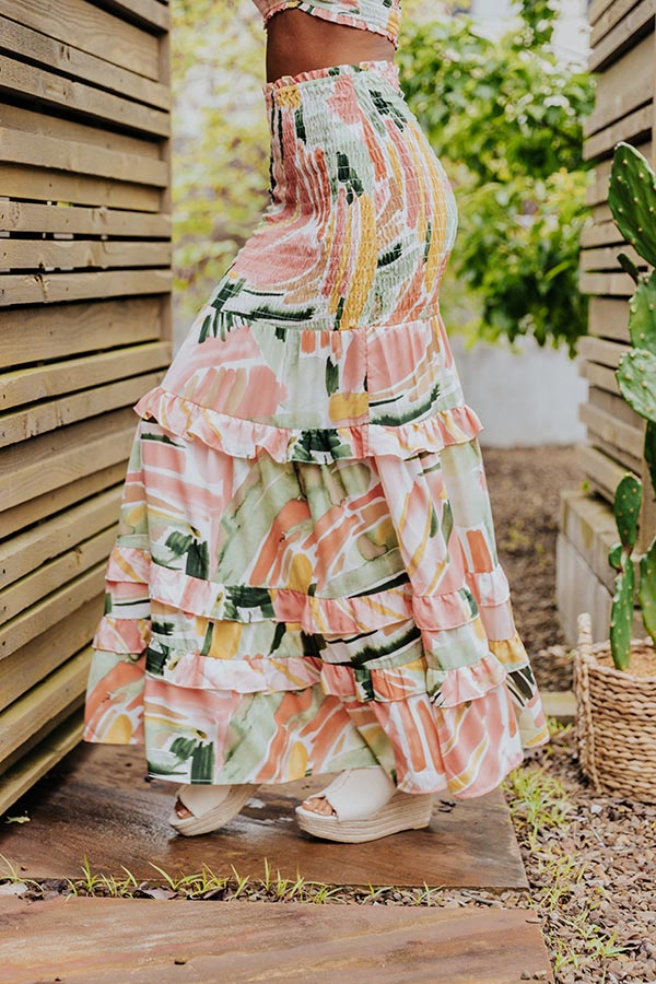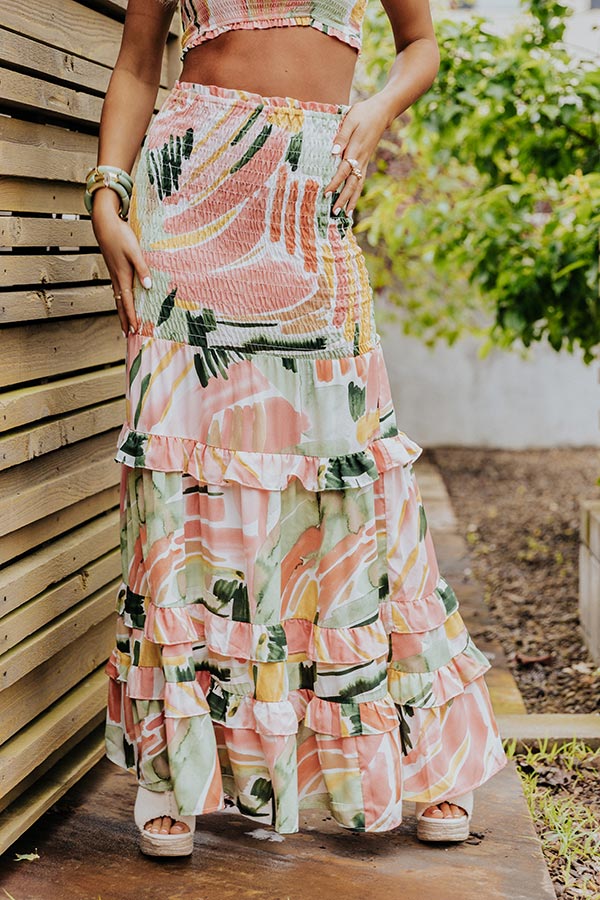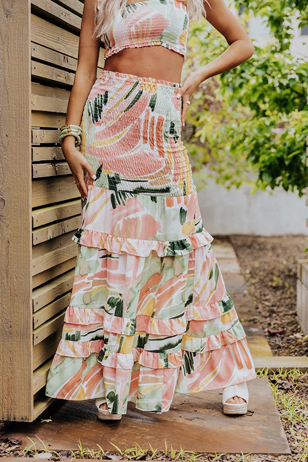 May all your summer dreams come true in this gorgeous skirt featuring lightweight smocked material pattered with an abstract peach, green, and mustard hued print, a high waistline, and a flattering figure hugging fit arouond the hips that flares into a tiered and ruffled silhouette with an uneven ankle-length hemline! Measurements