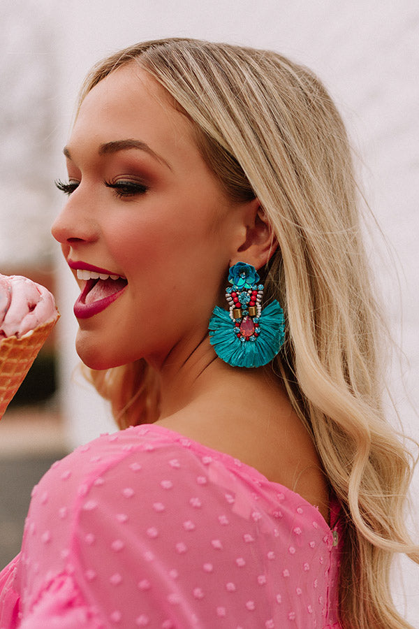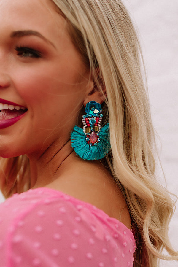 Show up in style to those "Bali Nights" by accessorizing with these adorable turquoise statement earrings featuring colorfully beads, sequins, and tassel fans!