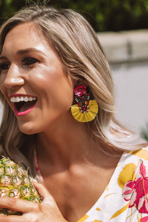 Show up in style to those "Bali Nights" by accessorizing with these adorable yellow statement earrings featuring colorfully beads, sequins, and tassel fans!