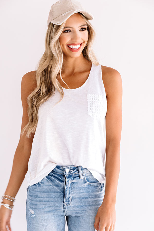 Surf through summer in style with this casual white shift top featuring soft lightweight material, a scooped neckline, 1-inch sleeveless shoulder straps, a single accent chest pocket with large mesh detailing, raw cut trim, and a relaxed silhouette that falls into a straight hemline! This beautiful basic styles perfectly with some distressed light wash skinnies, trendy sneakers, and a neutral baseball cap, but you can also wear it with "The Scout High Waist Shorts in Martini Olive," "The Lila Woven Flat," our "Dreams Of Tomorrow Wool Hat in Martini Olive," and our matching "Times Square Kisses Snake Print Tote in Brown!"