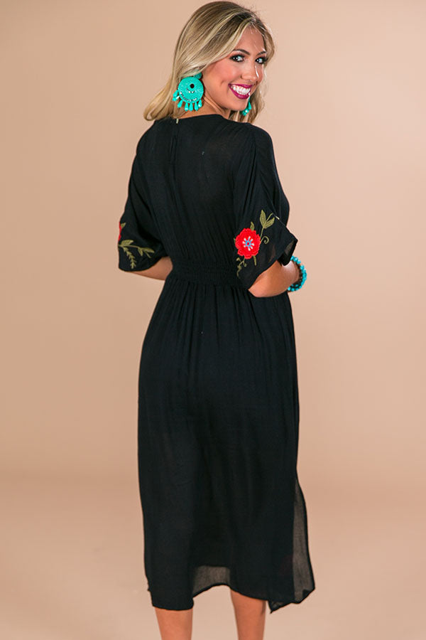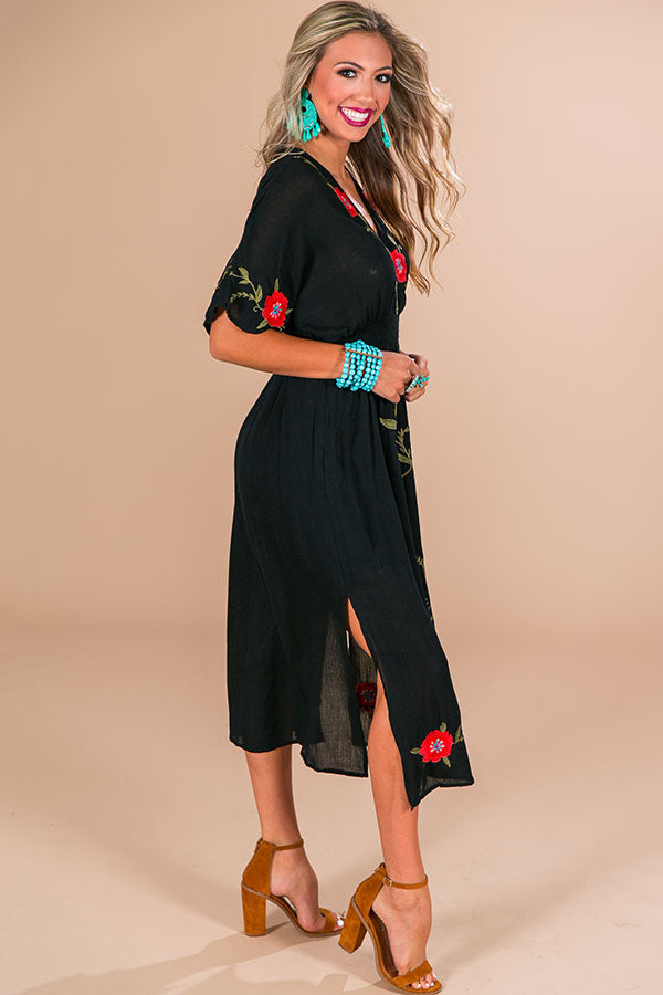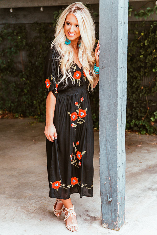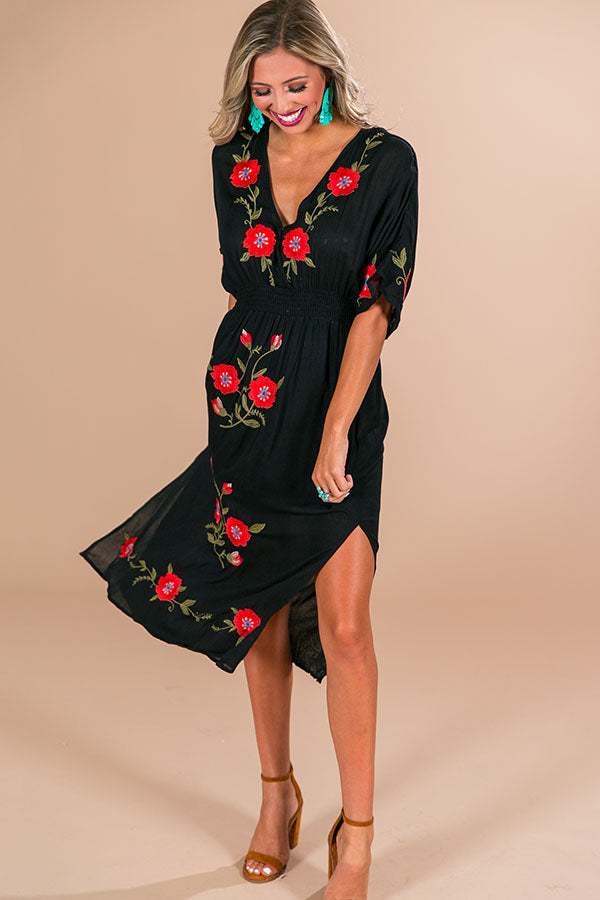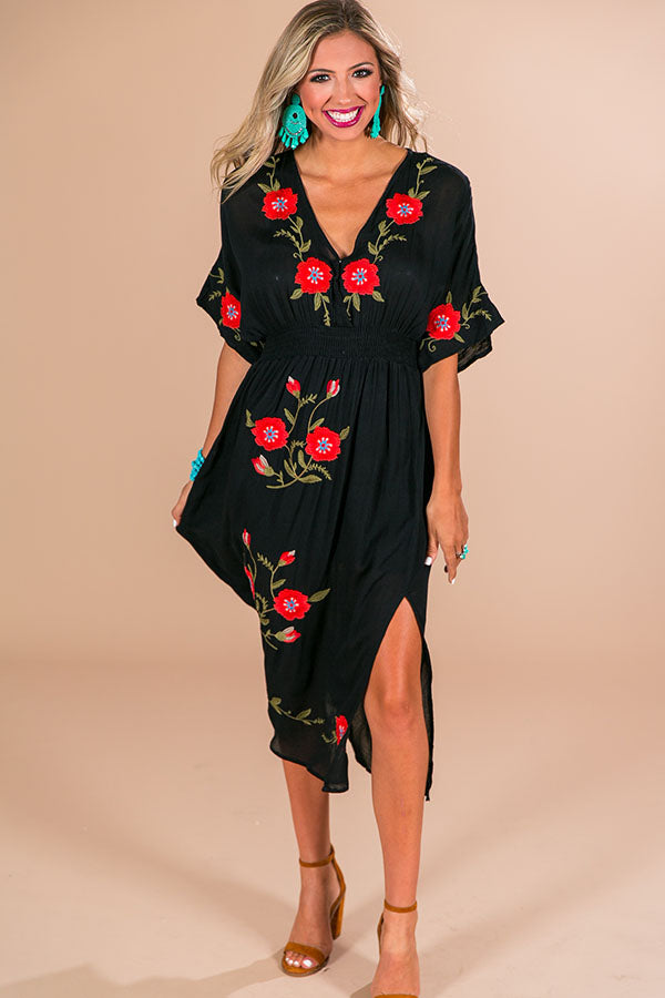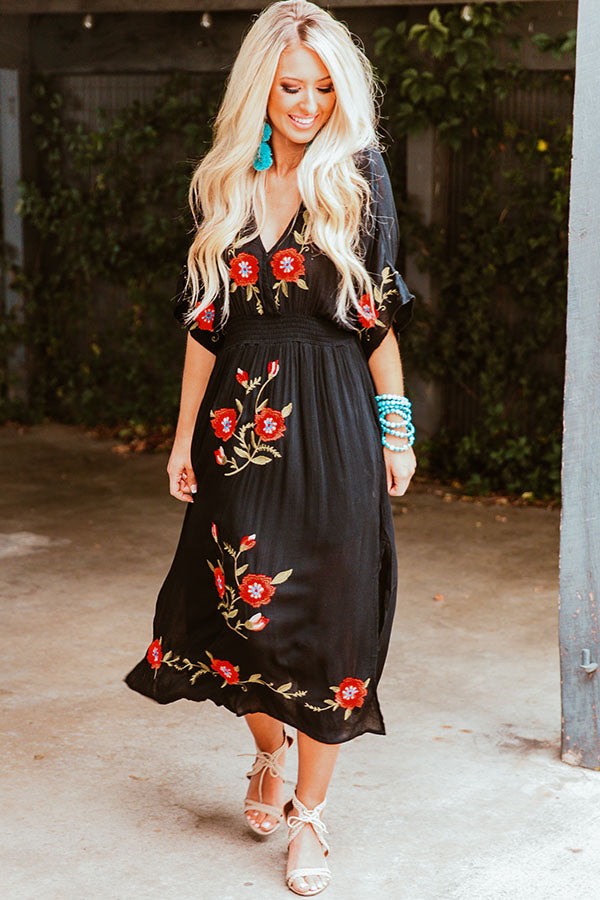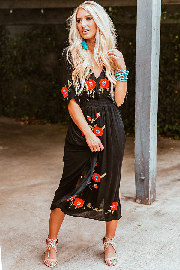 Barefoot on the beach is where you belong, in the "Barefoot On The Beach Embroidered Midi Dress!" This floral embroidered babe has short sleeves, a surplice bodice (with modesty snap closure), a ruched elastic waistline & an ultra chic midi length skirt with split sides. Complete your look with a colorful statement earring & a sassy pair of heels, and step out in style all season long in this must-have midi dress!