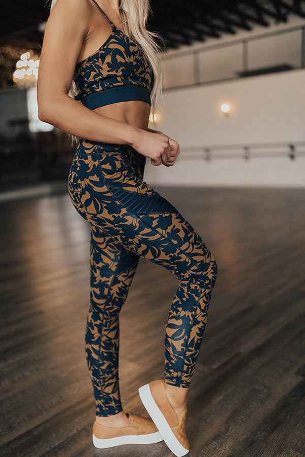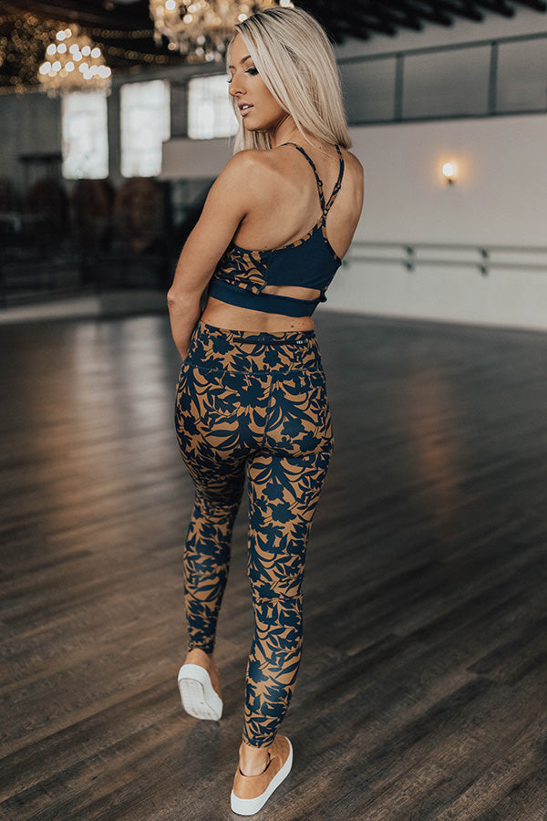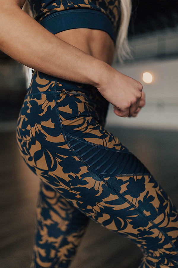 Our sporty 'Barre, Then Mimosas' active legging features sleek lightweight four way stretch material with a figure hugging fit, moisture wicking, a navy and mustard damask printed leggings, a slanted ribbed mesh panel across the thigh, an elastic high waist band, a zippered compartment along the back waist band, and a semi relaxed pant silhouette that falls into fitted cuffed hems!