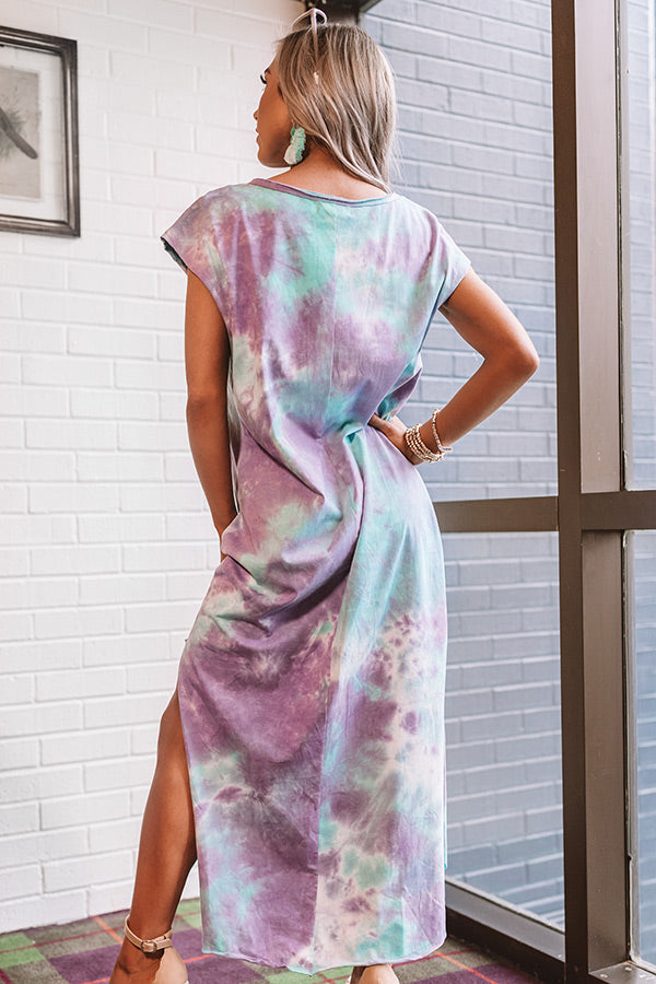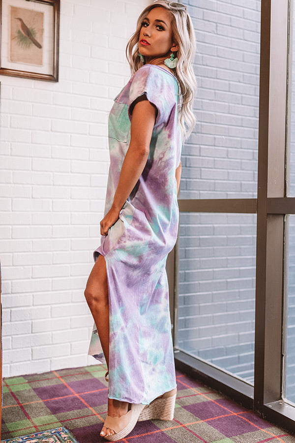 Watch the "bayside sunset" in style with this vibrant maxi featuring soft lightweight material patterned with a blue and purple hued tie dye print, a button up bodice with a v-cut neckline that can be worn off one shoulder, accent chest pockets, short loose sleeves, and an ultra relaxed silhouette that falls into a rounded mid-calf length hemline with knee-high side slits! We have styled this eye-catching piece with sunnies and neutral wedges, but you can also wear it with "The Avonlea Espadrille in Clear" and our "Champs And Cheers Transparent Crossbody!" Measurements