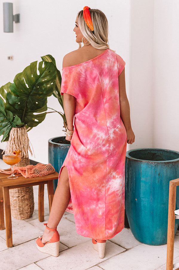 Watch the "bayside sunset" in style with this vibrant maxi featuring soft lightweight material patterned with a pink and orange hued tie dye print, a button up bodice with a v-cut neckline that can be worn off one shoulder, accent chest pockets, short loose sleeves, and an ultra relaxed silhouette that falls into a rounded mid-calf length hemline with knee-high side slits! We have styled this eye-catching piece with a matching wedge and headband, but you can also wear it with "The Avonlea Espadrille in Clear" and our "Champs And Cheers Transparent Crossbody!" Measurements