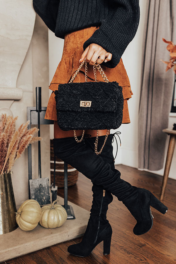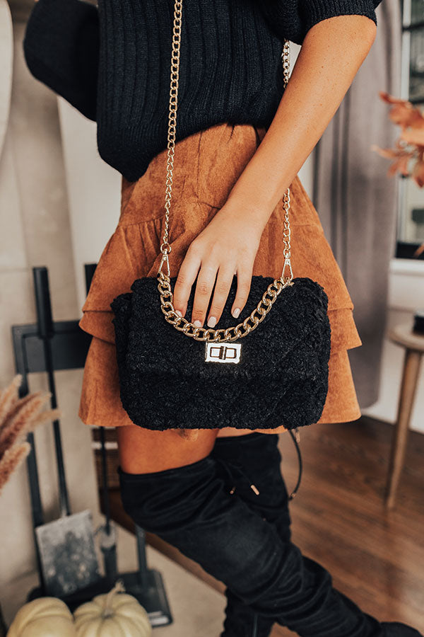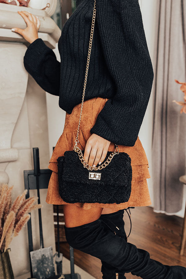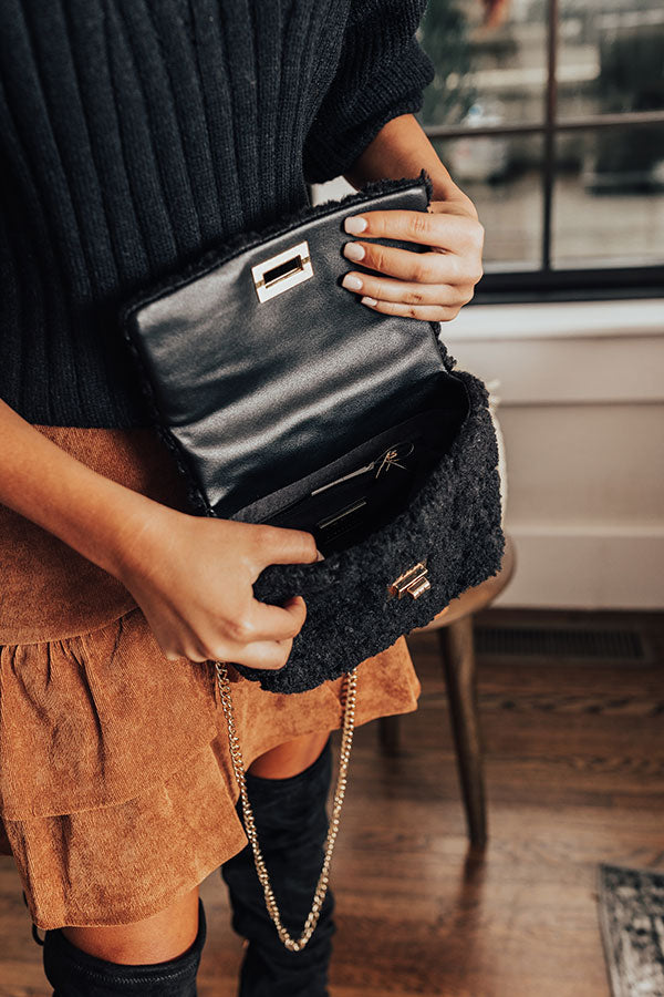 Add a unique piece to your handbag collection with our trendy black 'Be Yourself' crossbody featuring soft sherpa material with quilted texturing, a flap closure with gold twist hardware, a chain link handle and shoulder strap, and a spacious rectangular silhouette with an additional zip closure pocket inside!