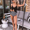 Get beach ready in these appealing bikini bottoms featuring lightweight four-way stretch material patterned with vertical black and white stripes on one side and solid black on the other, a high waistline for tummy control with an overlay trim accent, and a flattering form fitting silhouette that ends in a cheeky fit! Measurements