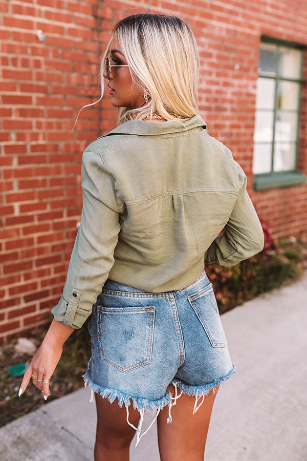 Get beach ready with this timeless army green top featuring lightweight material, long loose sleeves with roll tab cuffs, a button down front with a collared neckline, a single accent chest pocket, and a flattering silhouette that ends in a tied front hemline and a straight back hem! Measurements