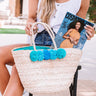 Get beach ready with this adorable summer tote featuring ivory hued woven material, blue hued pompom accent along the side, two rounded tote handles, and a spacious but lightweight fully lined pouch a zip closure and additional inside pockets!