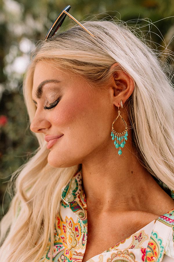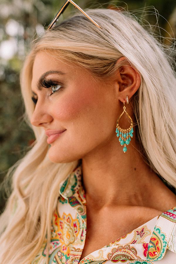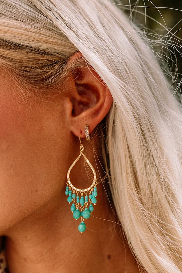 - Turquoise colored bead dangling gold teardrop hoop design with hammered detail