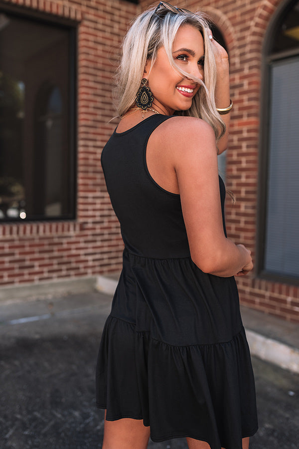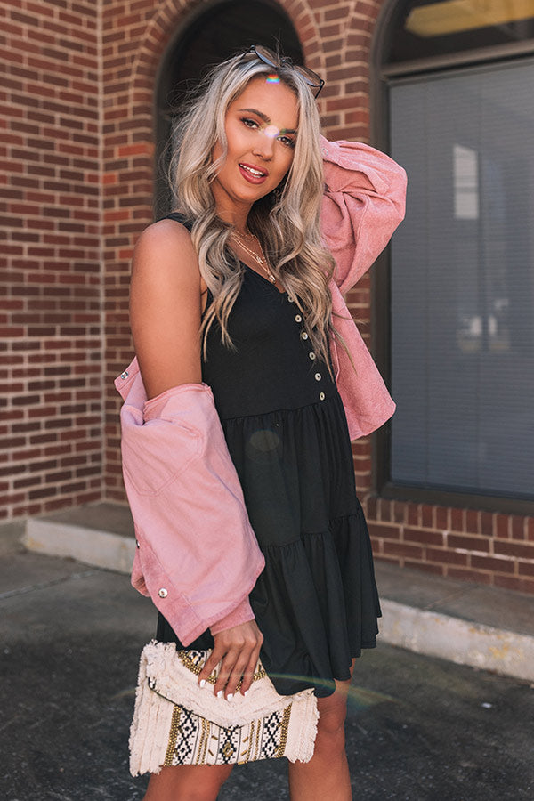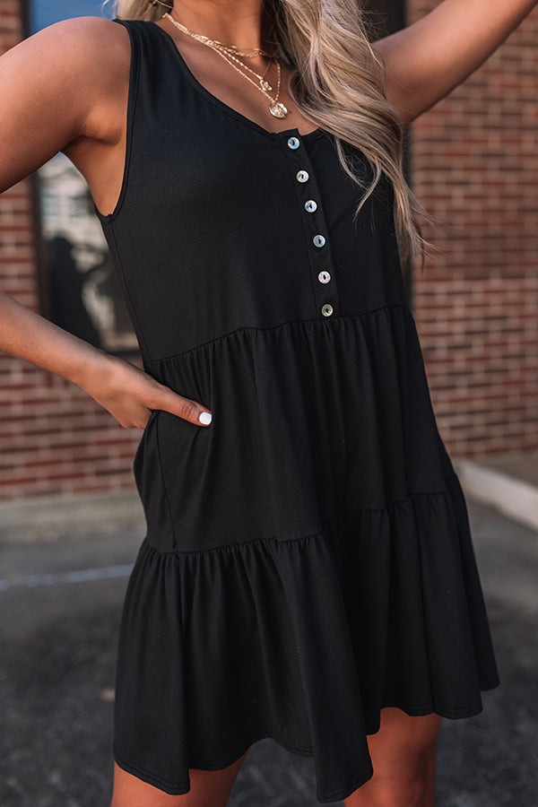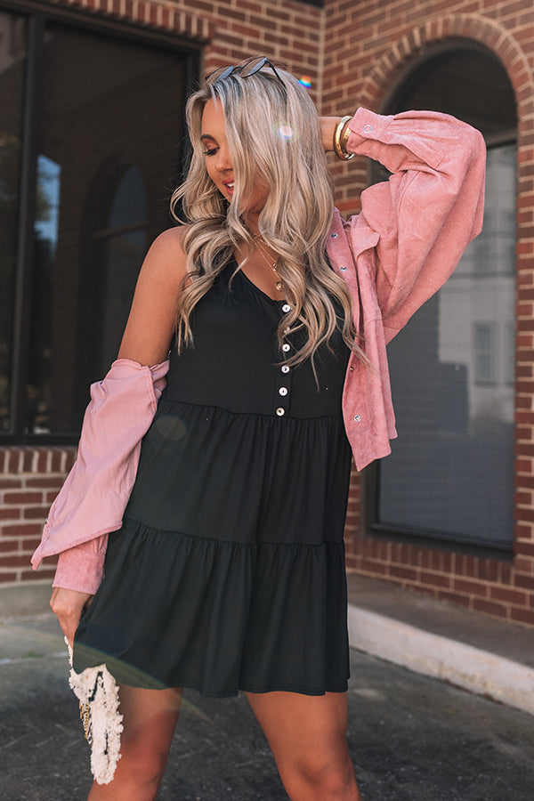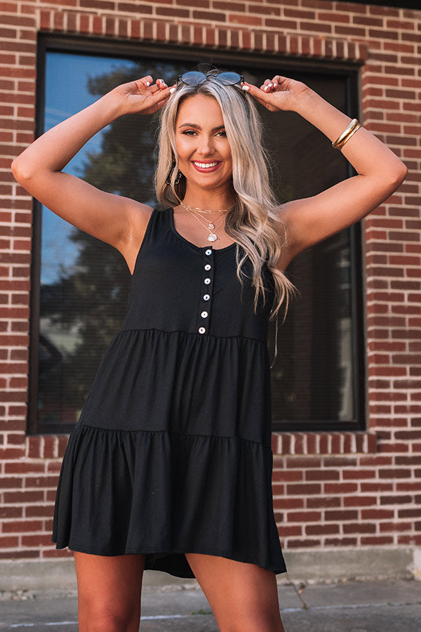 Enjoy a beach weekend looking stylish in this adorable black romper featuring lightweight material, a button up bodice with a scooped neckline, wide sleeveless shoulders, and a relaxed tiered silhouette that ends in straight upper-thigh length hemlines! Measurements