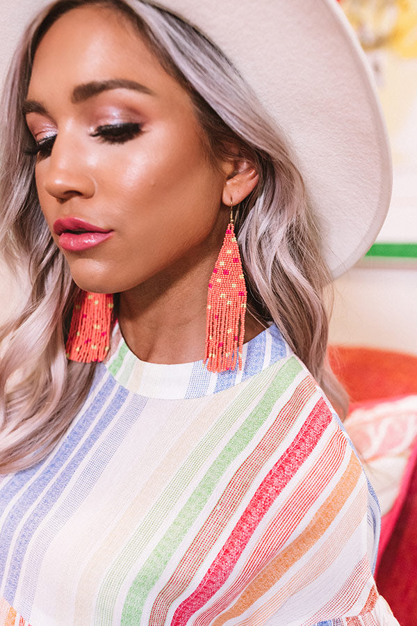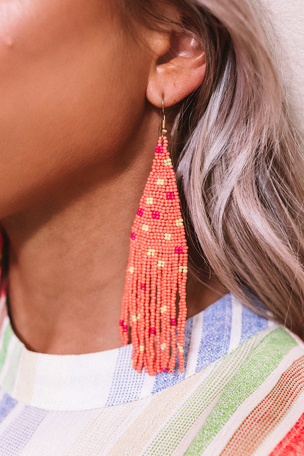 Our adorable "Beachside Reads" statement earrings are sure to dance along with you with their dangling coral colored beaded triangles and tassels patterned with pink and yellow polka dots!