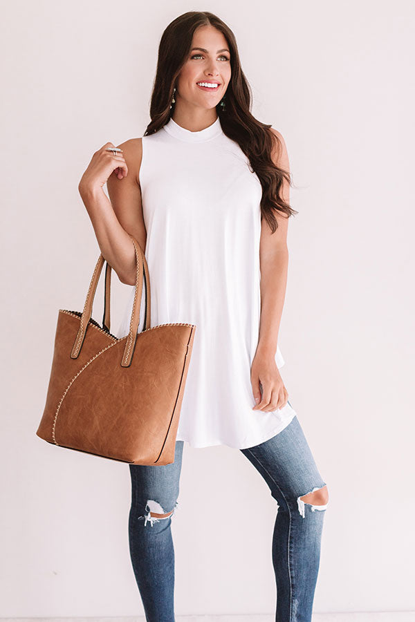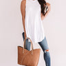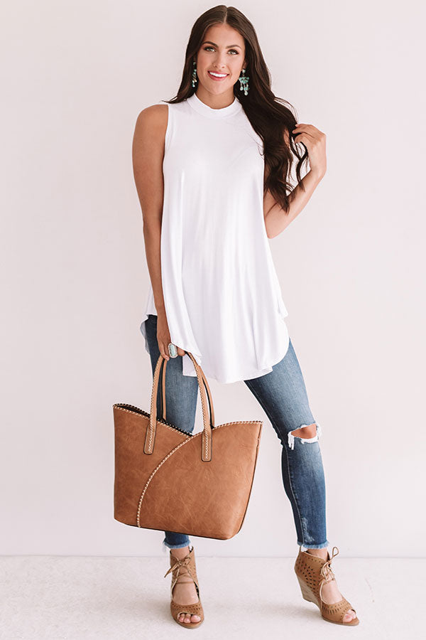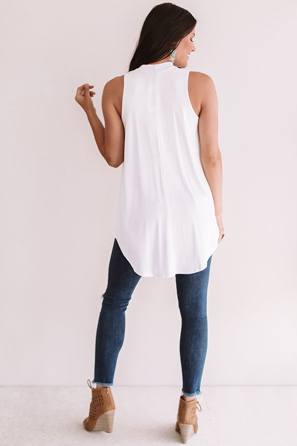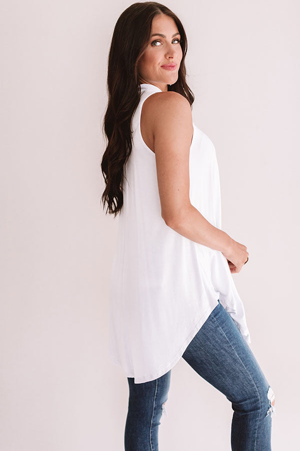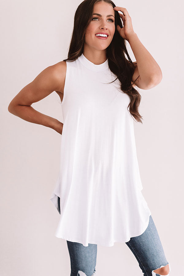 Last minute plans... no problem! Wherever the day takes you, go with the flow in the white "Beachy Beauty Shift Tank!" This effortlessly stylish tank has an ultra chic high neckline, a sleeveless bodice, and a relaxed jersey rayon silhouette with a rounded irregular hem. Complete your look with skinny jeans, a fun statement earring, and a sassy pair of wedges for a polished put-together look that you will wear time and time again!
