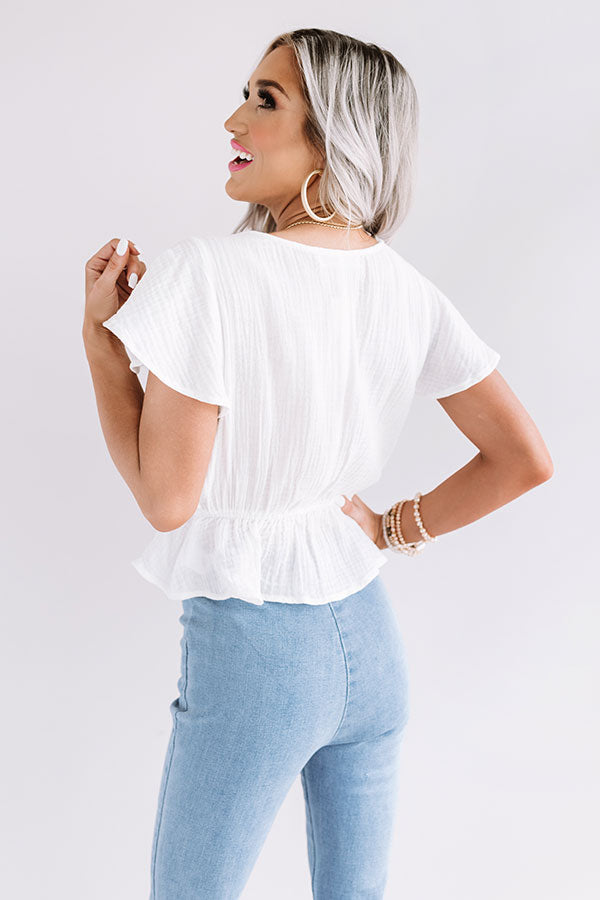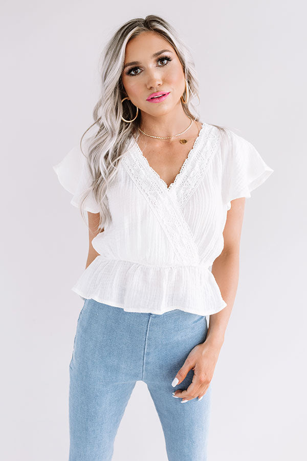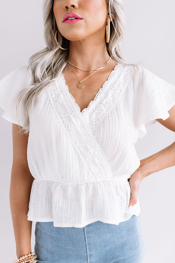 This adorable white top will have you looking brilliant at the beach with its lightweight material with subtle seersucker texturing, a v-cut neckline with intricate crochet accent trim, flared short sleeves, and a relaxed silhouette that falls into a cropped peplum bottom with an uneven hemline! We have styled this cutie with some light wash flares and a woven platform heel and tote, but you can also wear it with some distressed black shorts, "The Allen Wedge in Snake Print," and a matching snake print hair scarf! Measurements