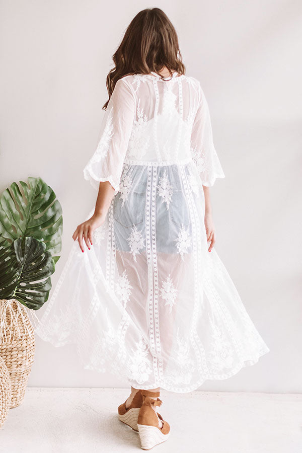 When you escaping reality at the beach this summer, you might as well add some daintiness to your getaway wardrobe with this lace duster! Its sheer, flowy fabric ties in the front, making it easy to wear over shorts and a tank top or over a swimsuit! Measurements