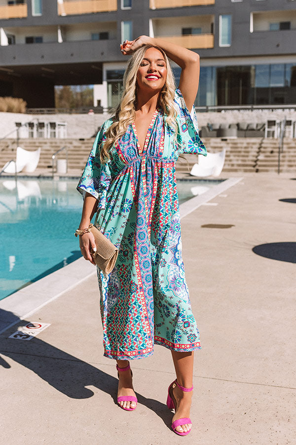You are sure to be someone's muse when you wear this eye-catching seaglass colored midi dress featuring lightweight breezy material patterned with intricate and colorful abstract prints, a v-cut neckline and upper back with a tie closure, oversized half sleeves, a fitted elastic banded waistline, and a relaxed silhouette that falls into a straight mid-calf length hemline with a thigh high accent slit! We have styled this photo worthy piece with a matching pink heel and neutral clutch, but you can also wear it with "The Allen Wedge in Seaglass" and our "Anywhere On The Map Sunnies in Ivory!" Measurements