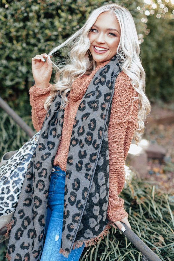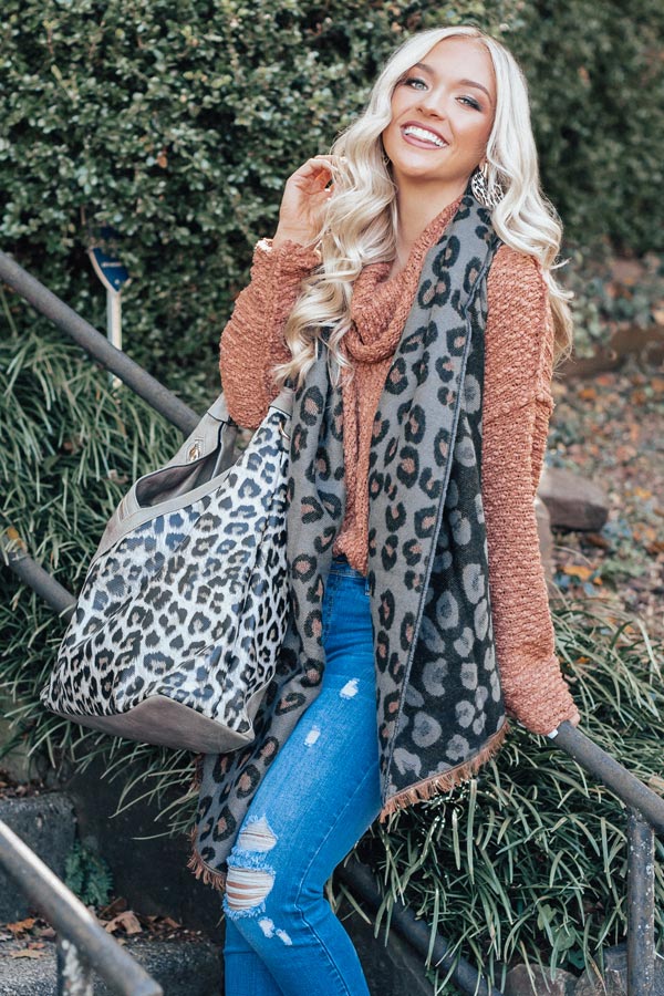 Add an extra piece of warmth to your fall OOTD with our charcoal colored "Beautiful Ambition" scarf featuring soft tight knit material patterned, a bold black and neutral leopard pattern, and subtle fringed edge detailing!