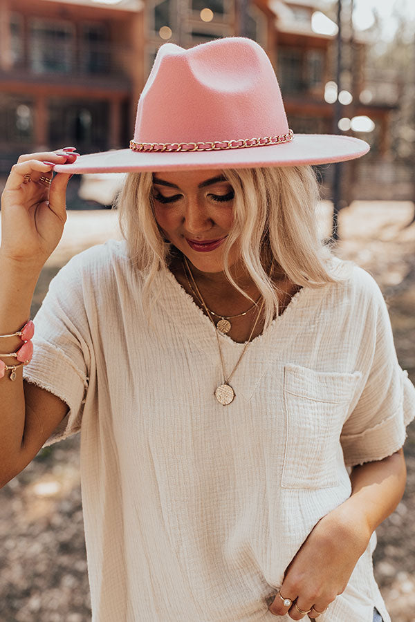 Add a chic touch to your look with this beautiful pink fedora featuring lightweight felt material, a 3.5-inch brim, and a gold chain link accent band!