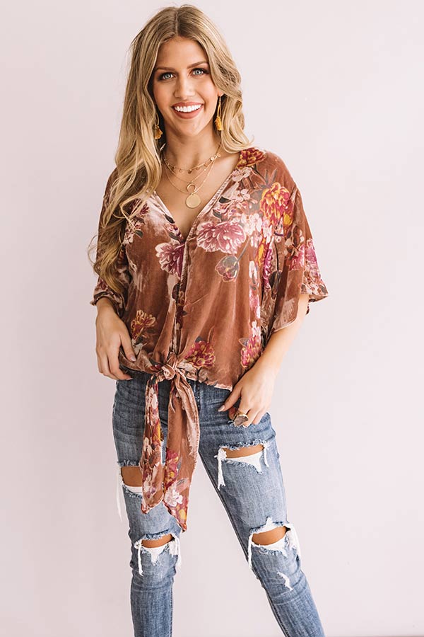 Our rustic rose colored "Beauty And Bubbles" top would make a sweet edition to any OOTD with its lightweight velvet material, a unique colorful floral pattern, loose draped half sleeves, a v-cut neckline, and a relaxed silhouette that falls into a knotted hemline and a straight back hem! You can style this adorable transitional top a variety of ways, like under a cardigan with some distressed ankle skinnies, a matching crossbody, and neutral peep toe booties, or with our "Positive Vibes Faux Suede Skort in Camel," our "Plans In Paris Wool Hat in Pink," and "The Jess Faux Leather Heel in Natural!" Measurements