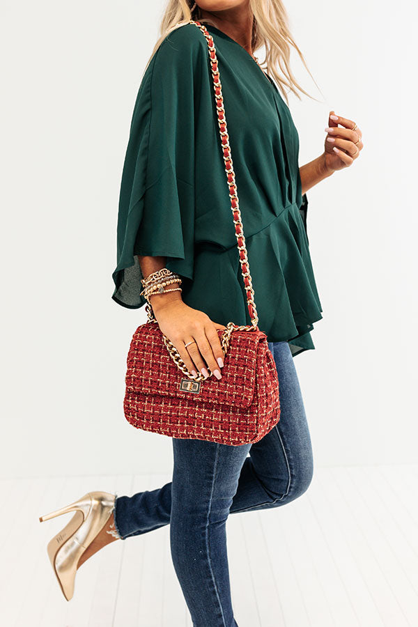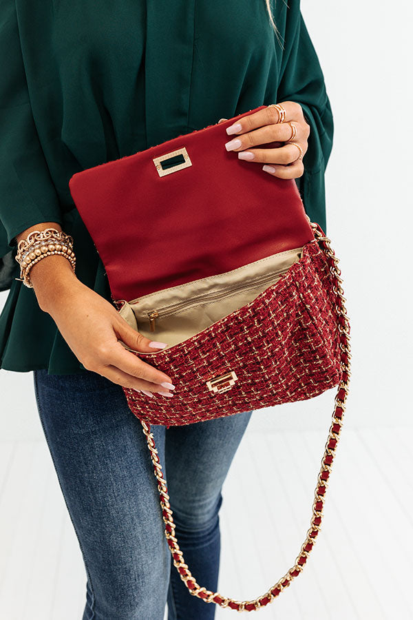 You will look like a true fashionista when you carry your everyday essentials in our high end crimson colored 'Before Happy Hour' purse featuring chic tweed material, a flap closure with gold twist hardware, a gold handle and shoulder strap, and a spacious fully lined interior with an additional inside pocket!