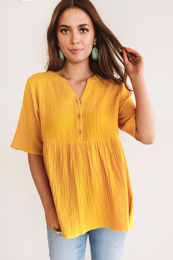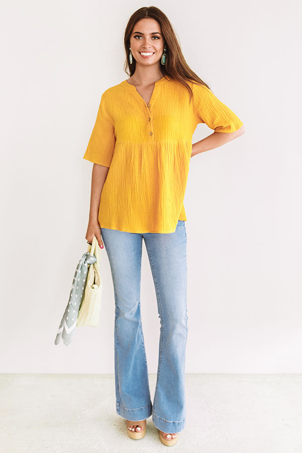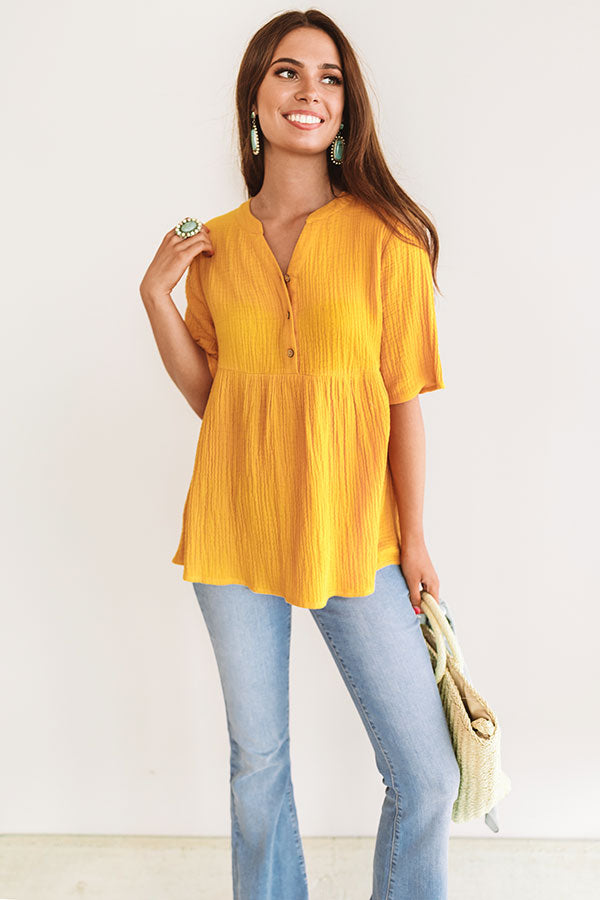 This casual primrose yellow top is adorned with a button up bodice, v-neck, subtly ribbed texture, and a loose peplum bottom! It can be paired with flared jeans and wedges or with our "Maddox High Waist Distressed Shorts" and "The Kamryn Stripe Sandal in Primrose Yellow" for a practical OOTD that will take your from a bellini brunch to a summer social! Measurements