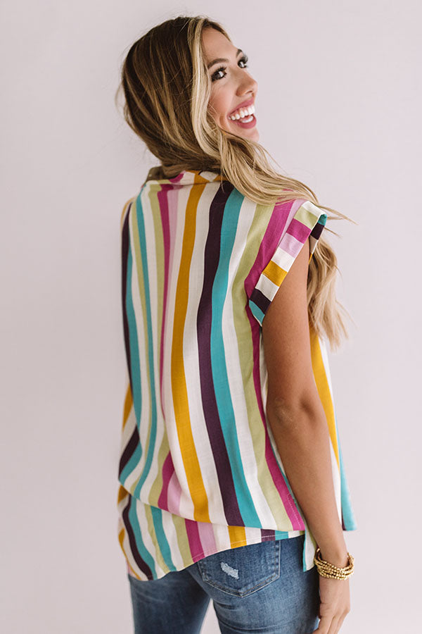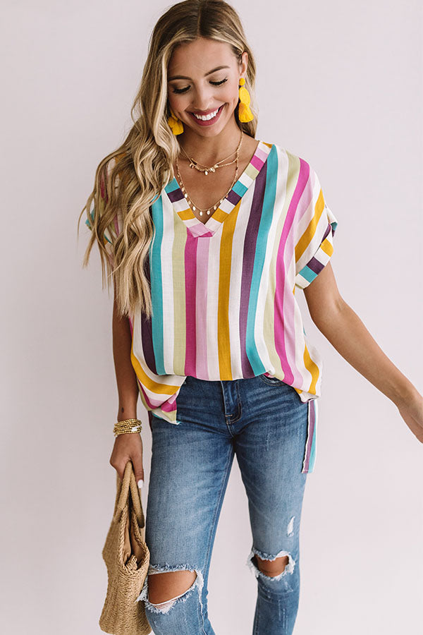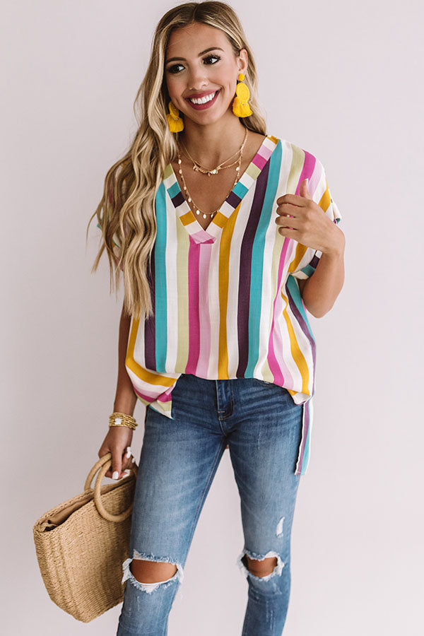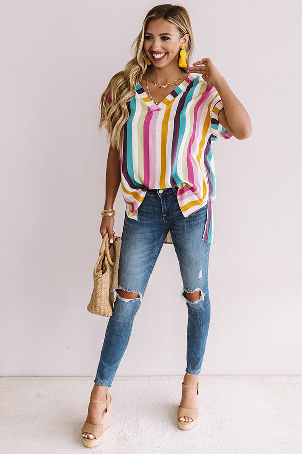 We guarantee this shift top is "stripe" up your alley with its vertical colorful stripes, cuffed sleeves, v-neck, and hem slits on both sides! For the perfect "Bellinis with besties" outfit, you can style this piece with some distressed skinny jeans, nude wedges, and a straw tote or tucked into white bottoms like "The Quincy Midrise Flares" or "The Asher High Waist Shorts" and colored sandals like our turquoise "Jewell Lace Up Sandal!"