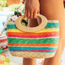 Multi-color woven tote with wooden tote handles.