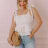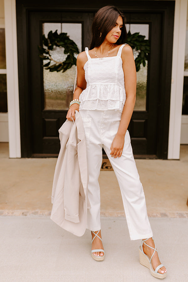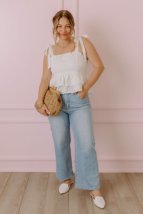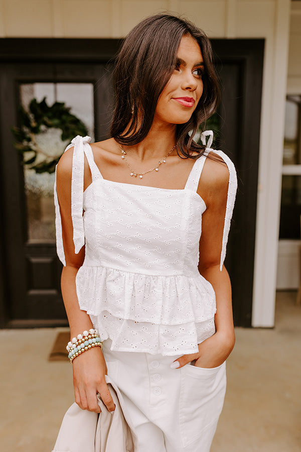 You will look absolutely darling in this adorable white 'Bermuda' tank featuring lightweight material with intricate eyelet detailing, a square neckline and upper back with 1-inch tie closure shoulder straps, and a flattering silhouette that ends in a two-tiered ruffle hemline!