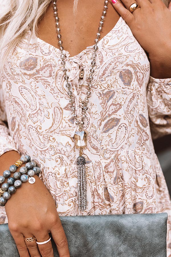 We have no doubt you will be besotted with how beautiful this statement necklace is with its long beaded chain, oversized gemstone, and beaded tassel detail!